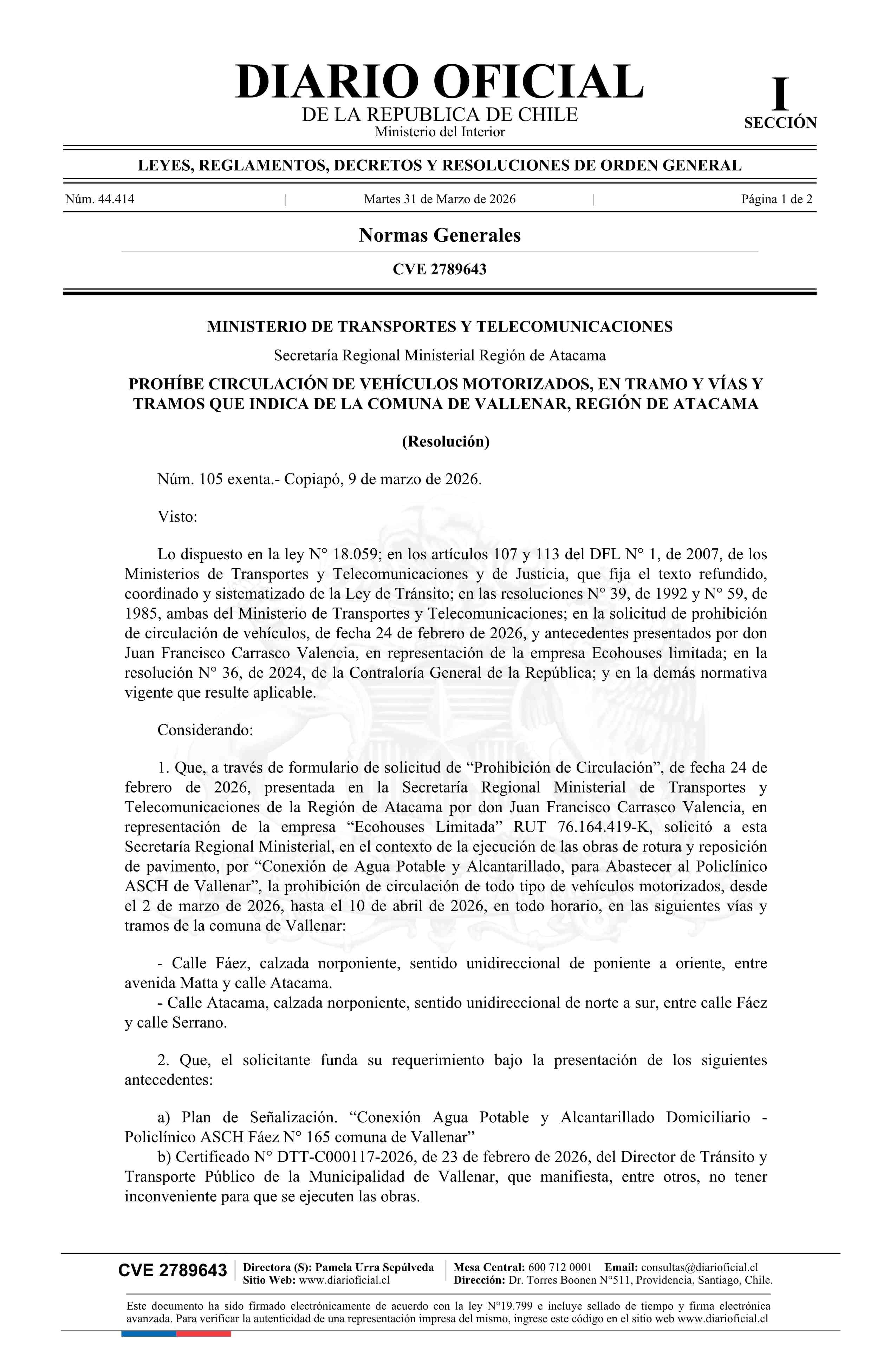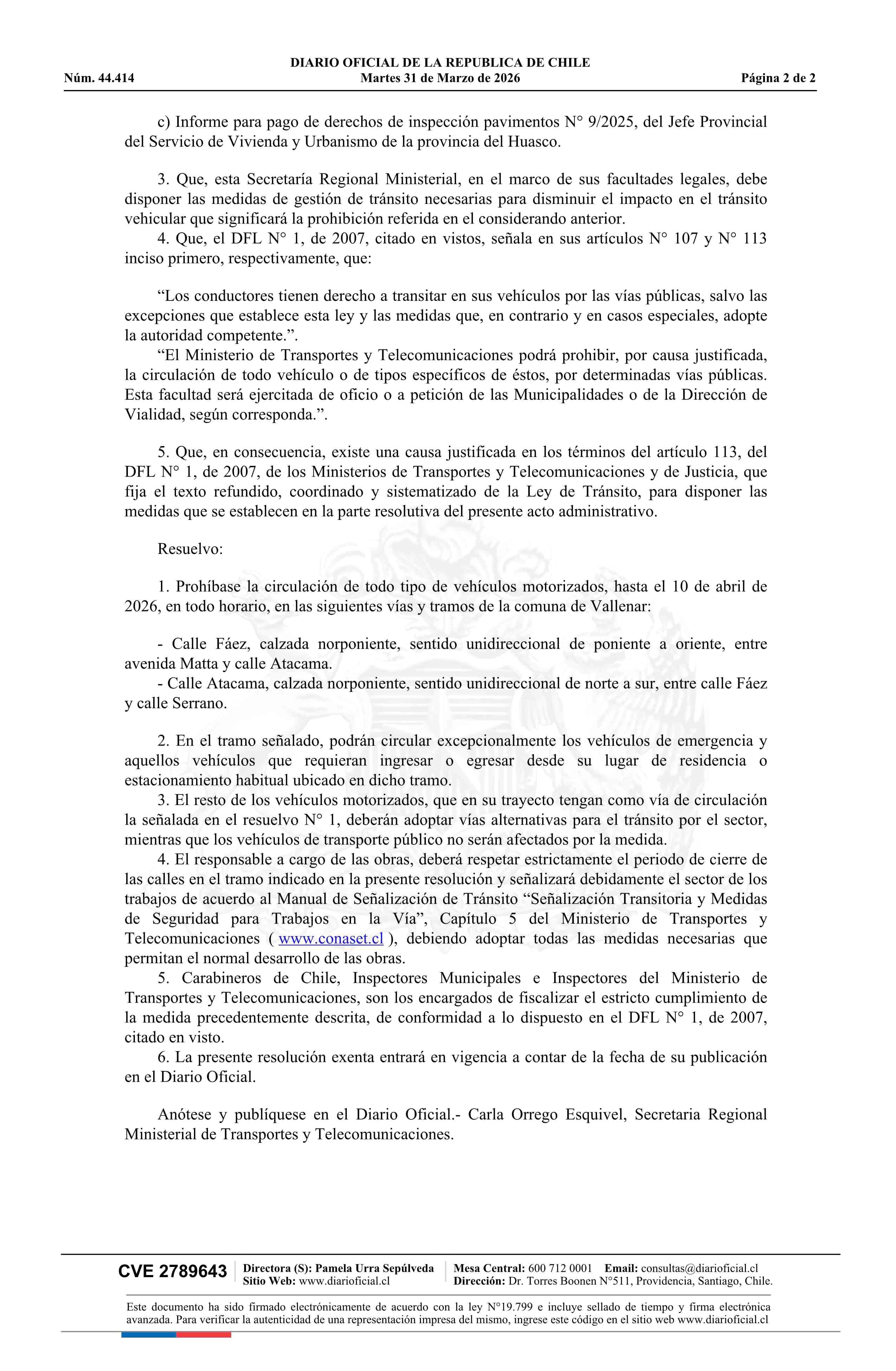 Título: Resolución exenta número 105, de 2026.- Prohíbe circulación de vehículos motorizados en tramos y vías que indica, de la comuna de Vallenar, Región de Atacama