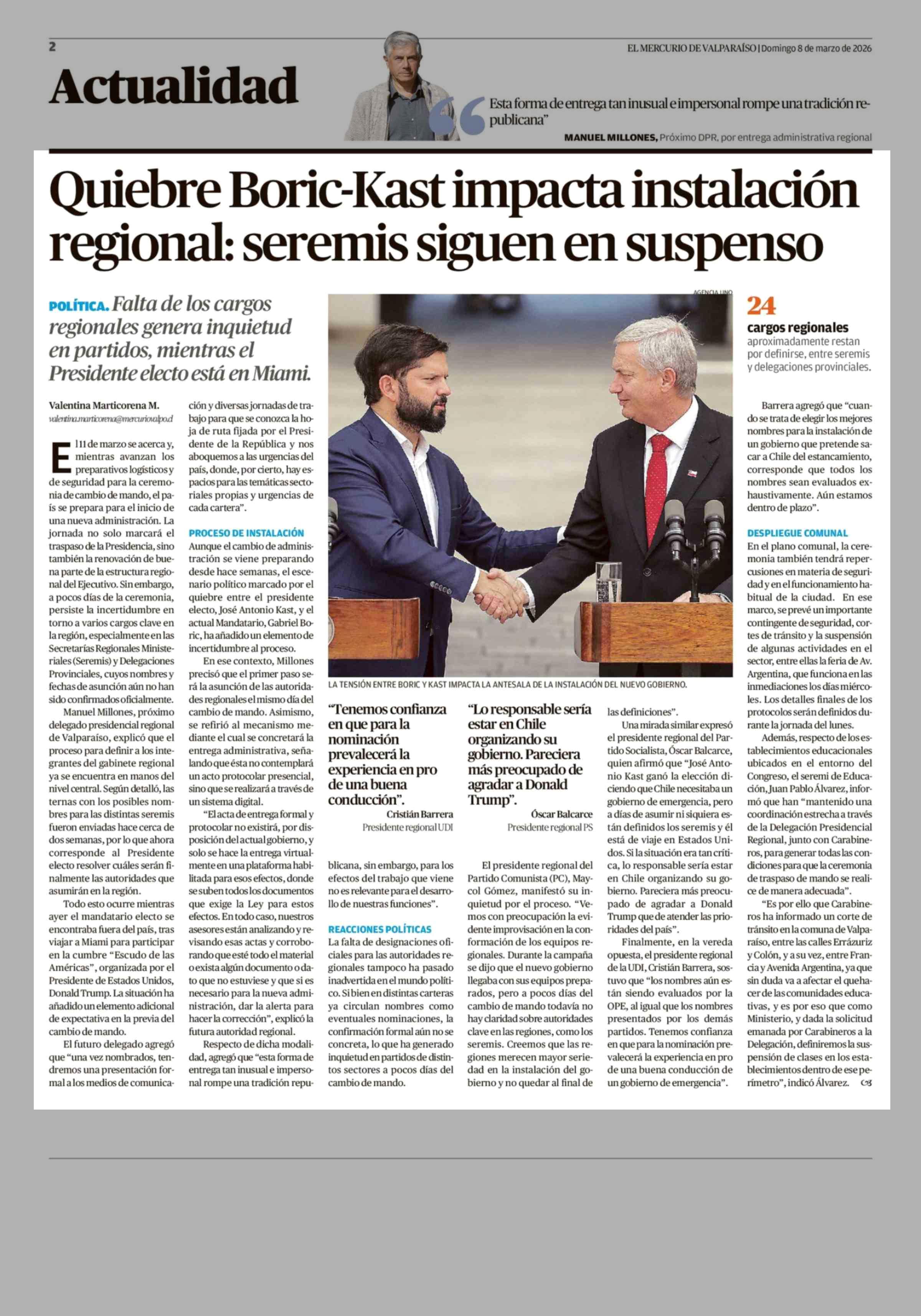 Quiebre Boric-Kast impacta instalación regional: seremis siguen en suspenso 08-03-2026 El Mercurio de Valparaíso |