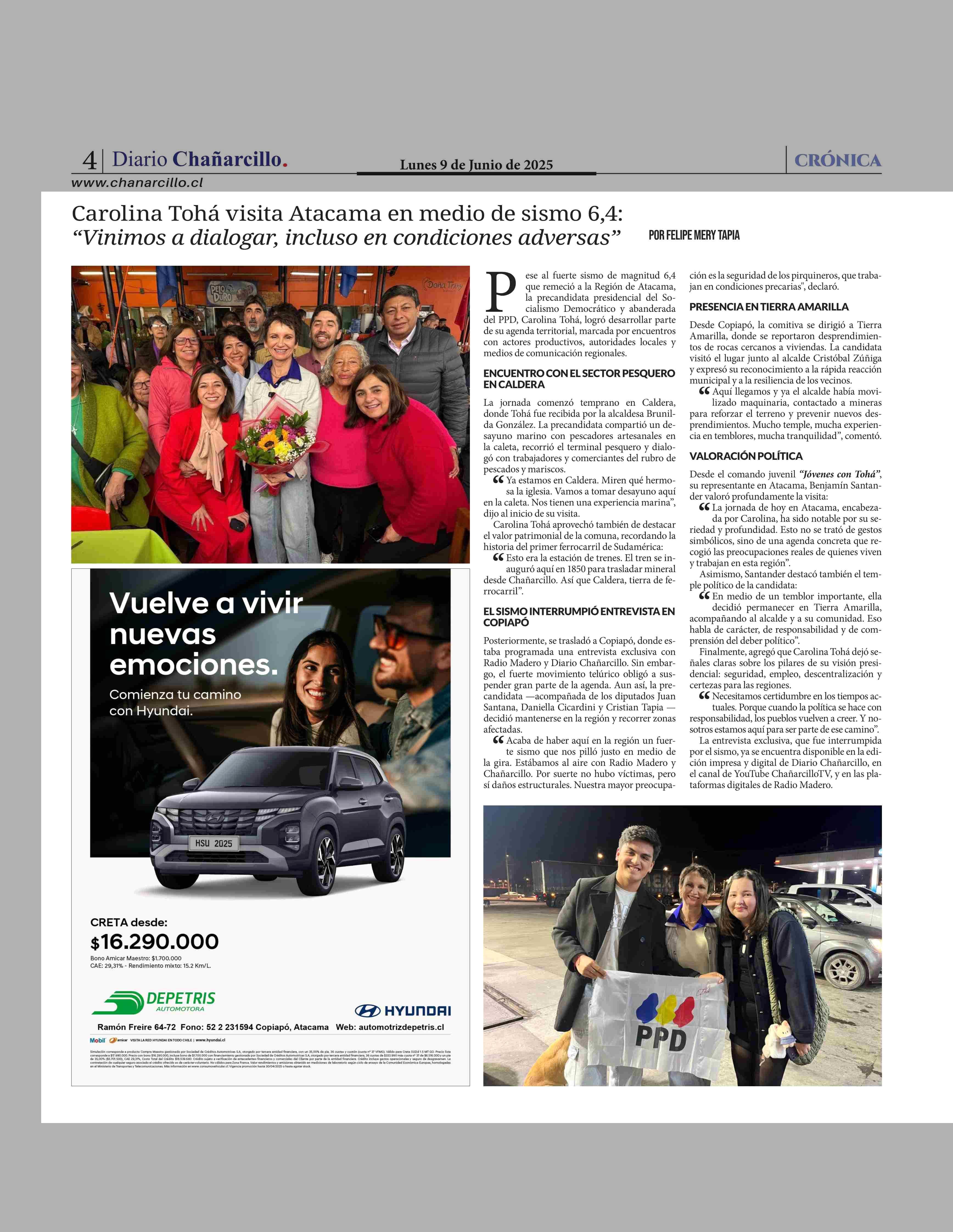 Carolina Tohá visita Atacama en medio de sismo 6,4: "Vinimos a dialogar, incluso en condiciones adversas" 09-06-2025 Diario Chañarcillo |