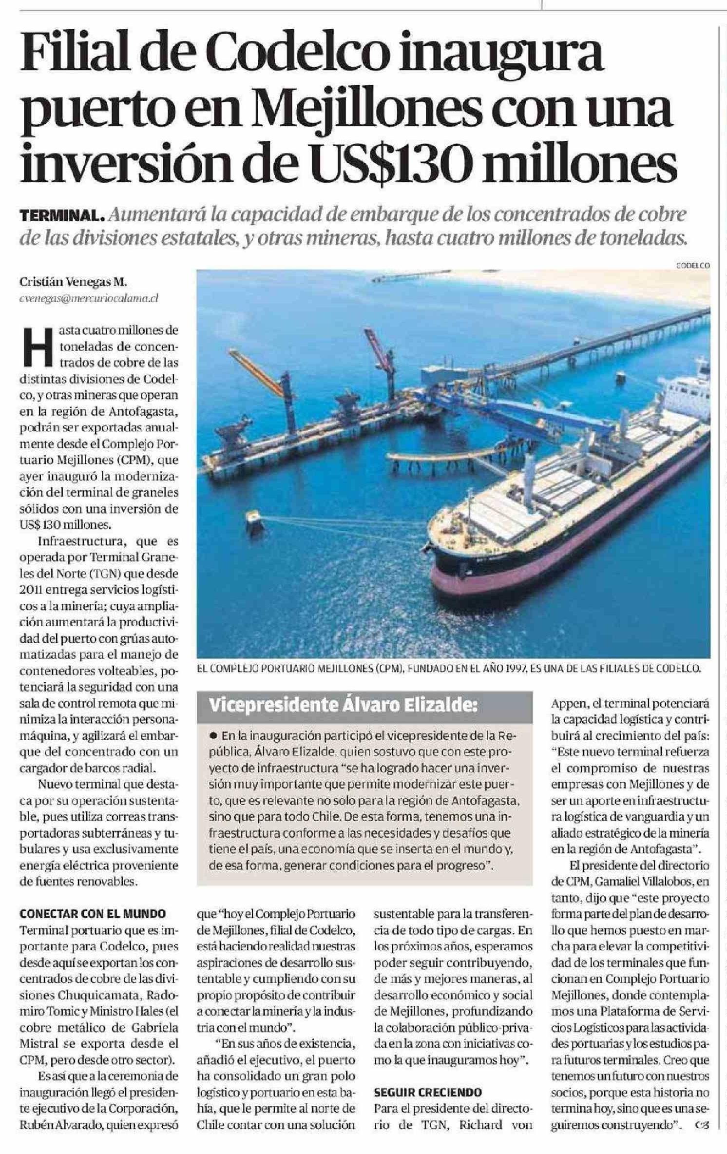 | Título: | Filial de Codelco inaugura puerto en Mejillones con una inversión de US$130 millones |