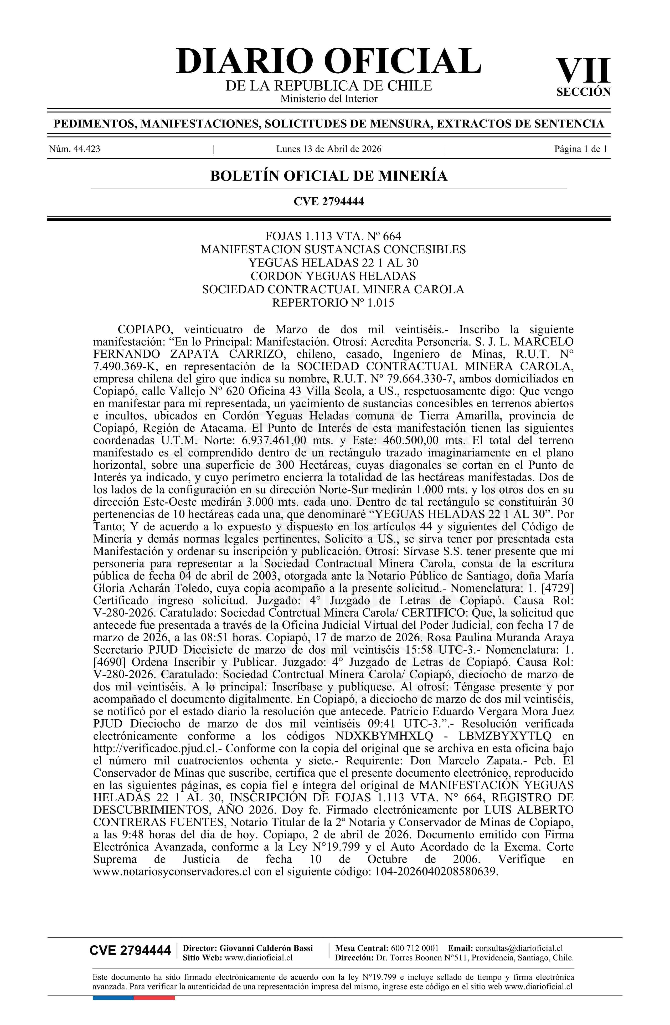 YEGUAS HELADAS 22 1 AL 30 / SCM Carola 13-04-2026 DIARIO OFICIAL CHILE - BOLETÍN OFICIAL DE MINERÍA |
