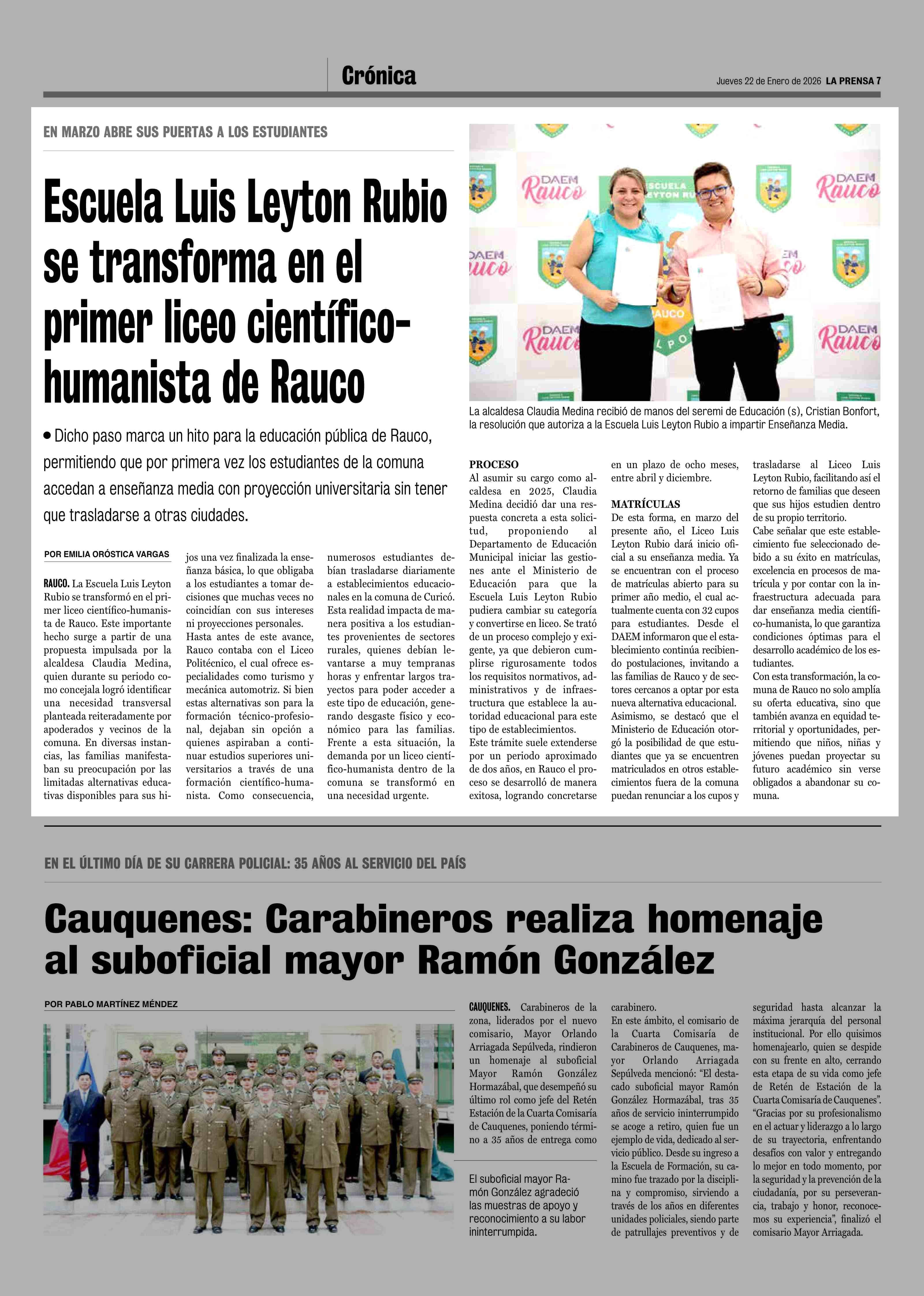 Escuela Luis Leyton Rubio se transforma en el primer liceo científicohumanista de Rauco 22-01-2026 La Prensa de Curicó |