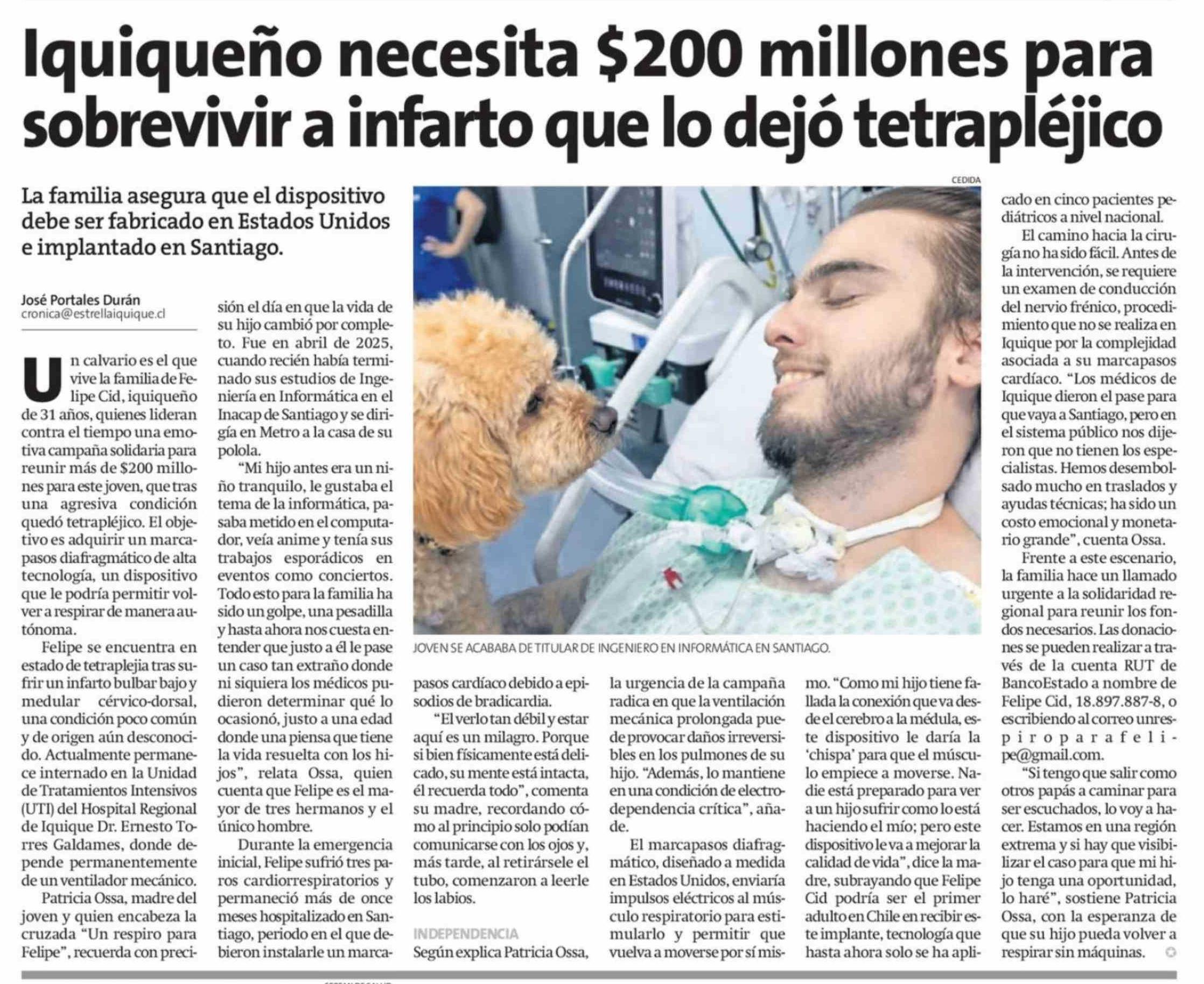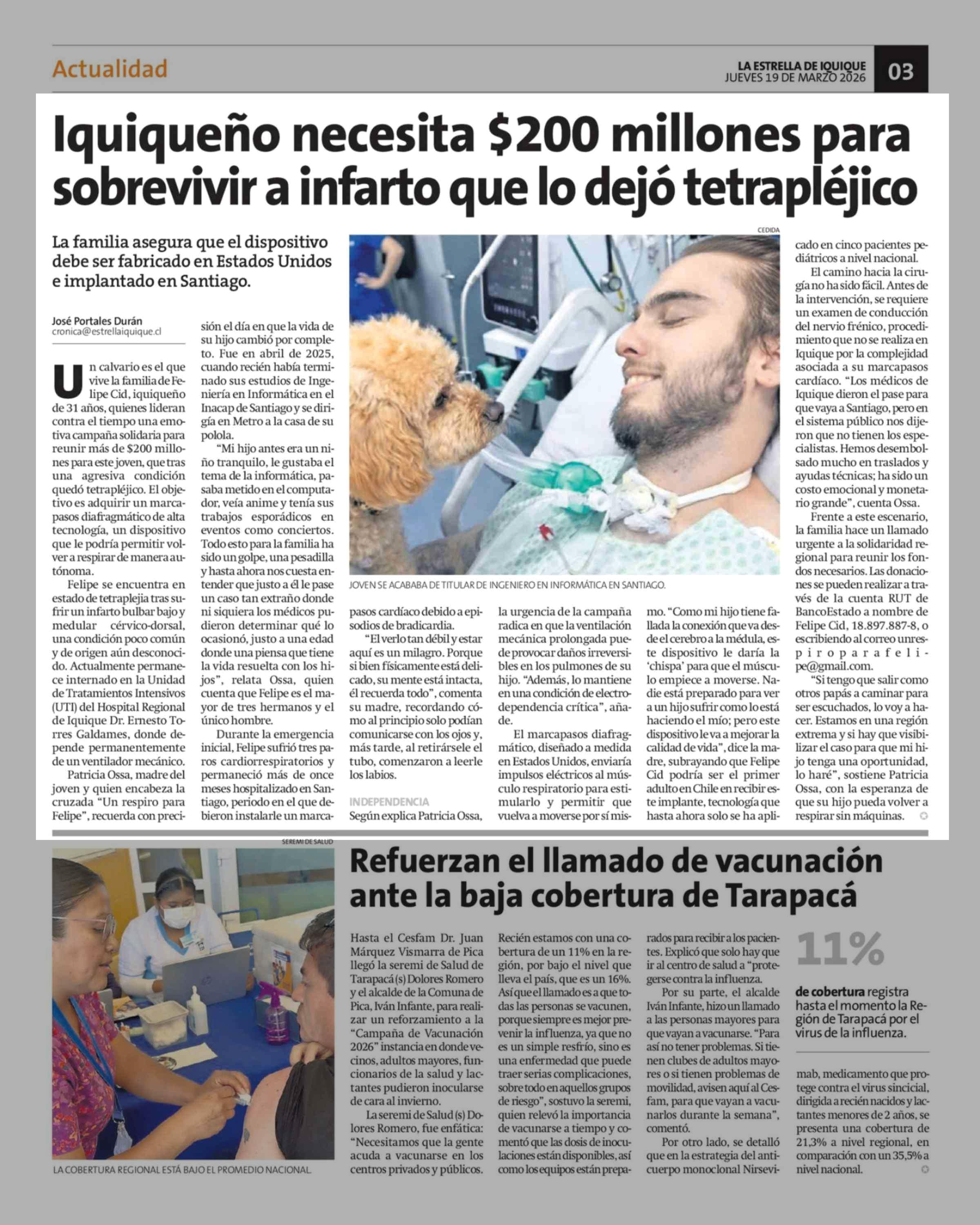 Iquiqueño necesita $200 millones para sobrevivir a infarto que lo dejó tetrapléjico 19-03-2026 La Estrella de Iquique |
