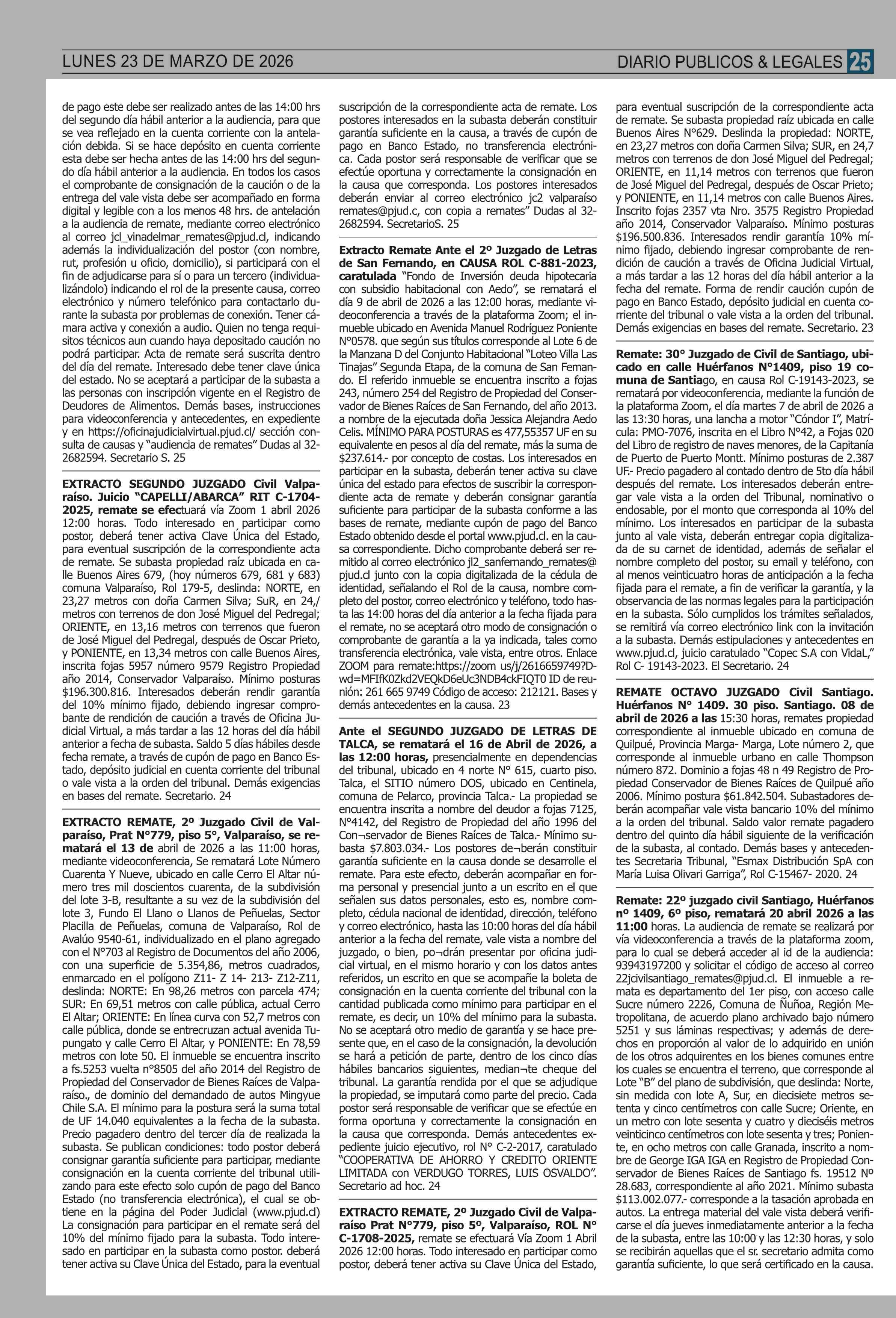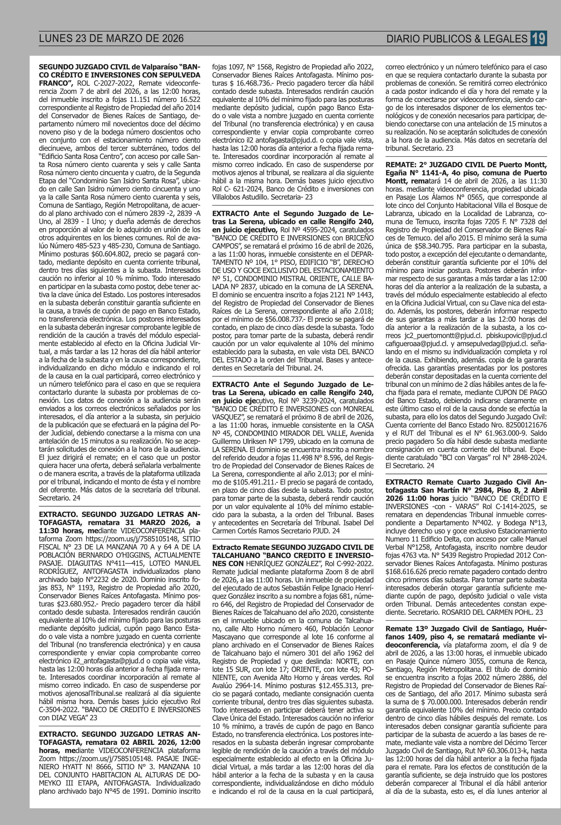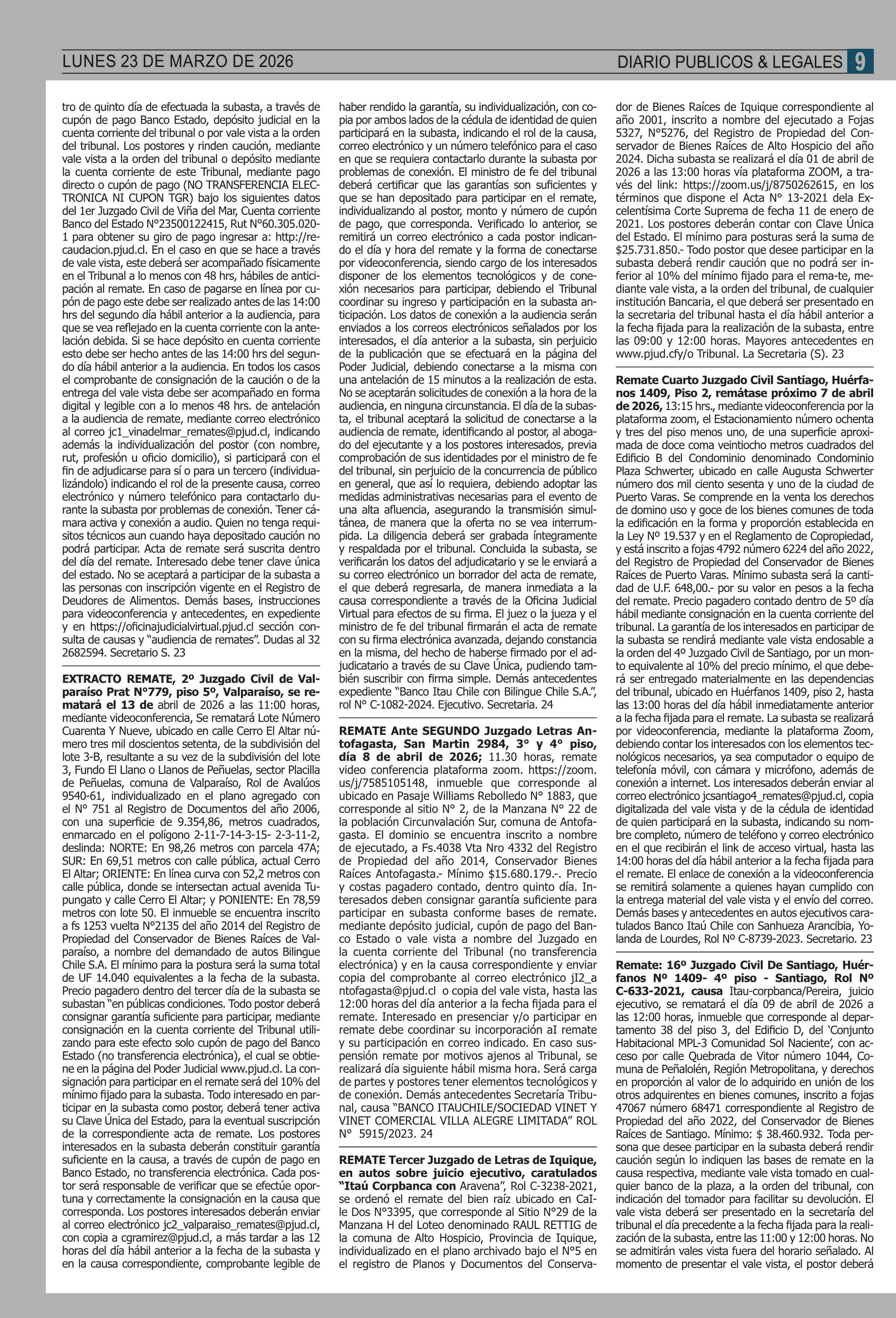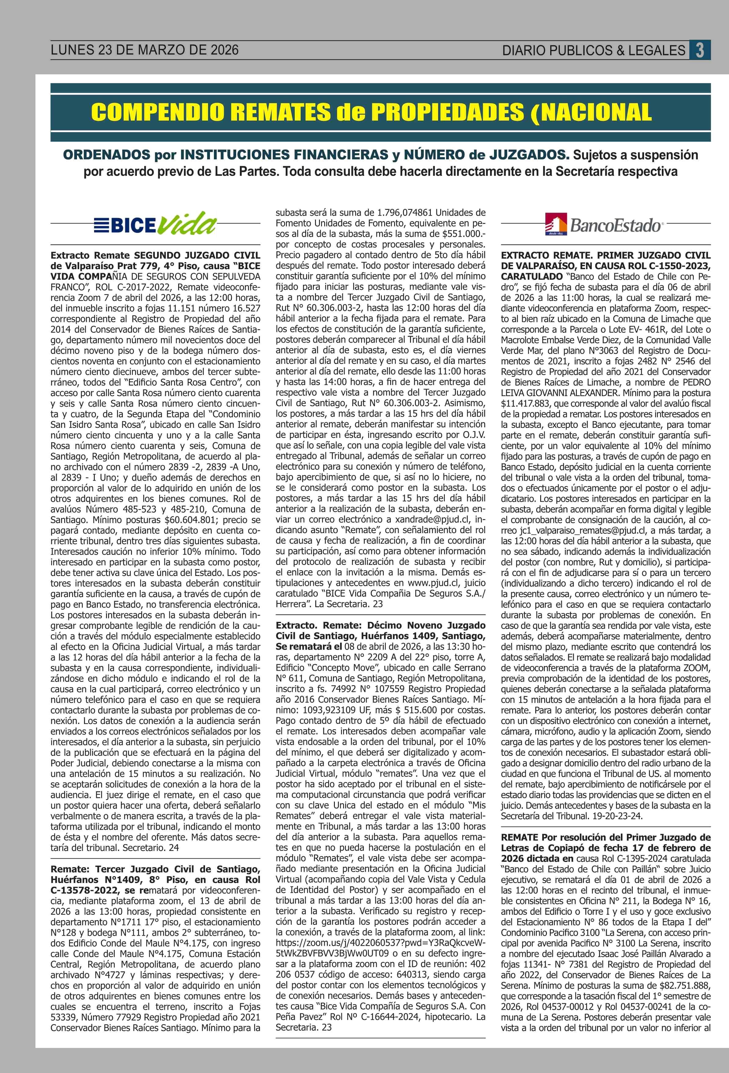 REMATES: COMPENDIO REMATES de PROPIEDADES (NACIONAL 23-03-2026 P&L Públicos y Legales |