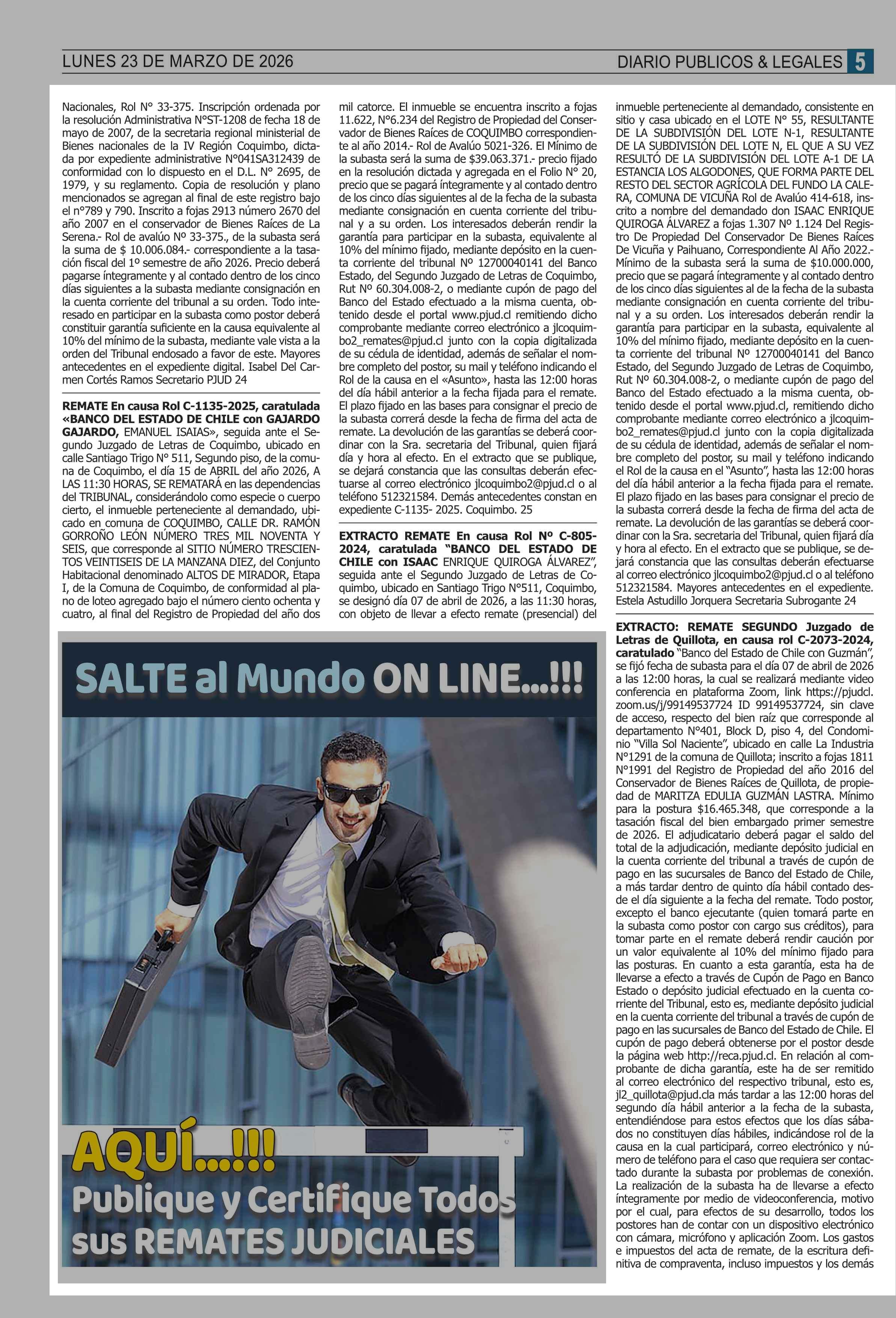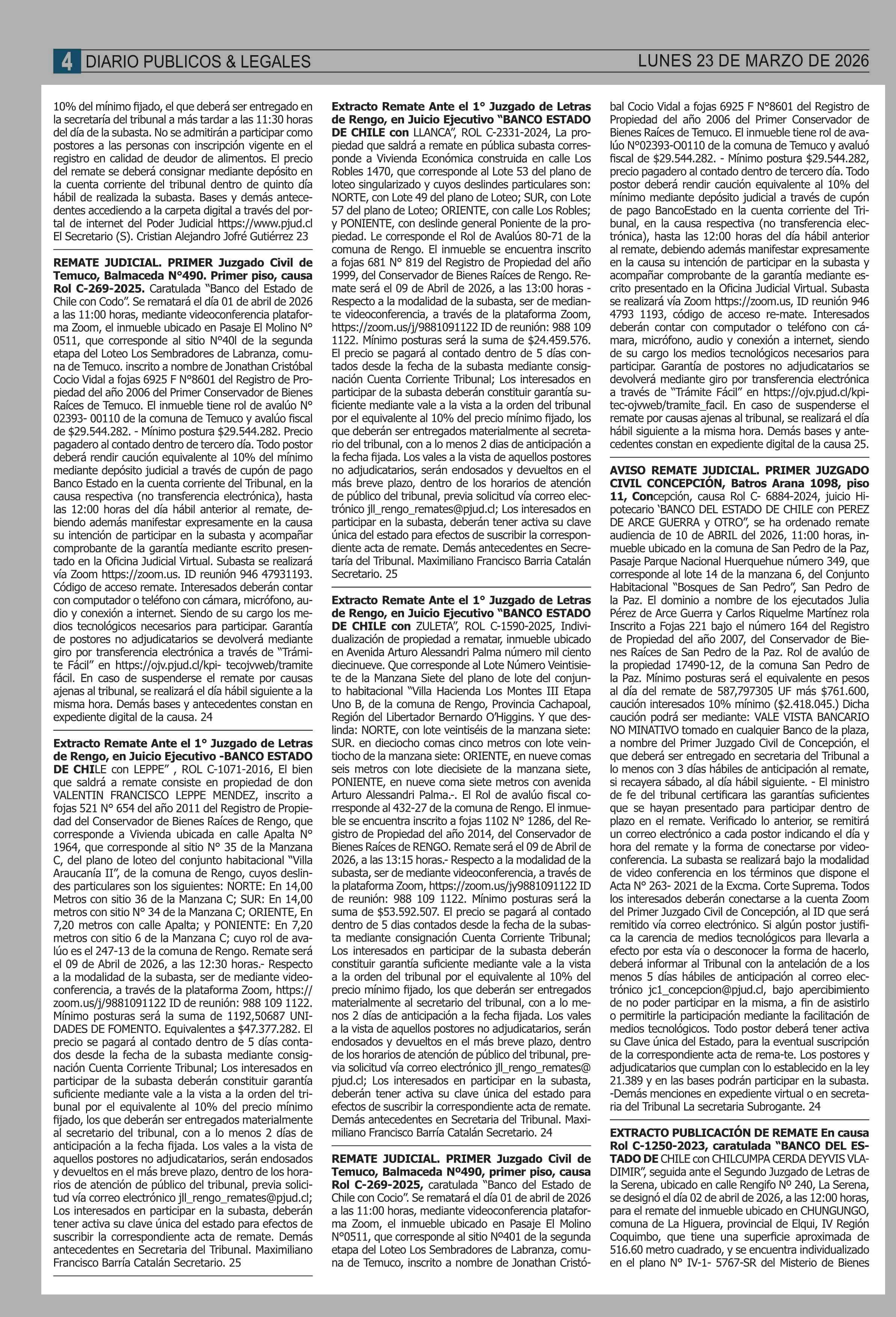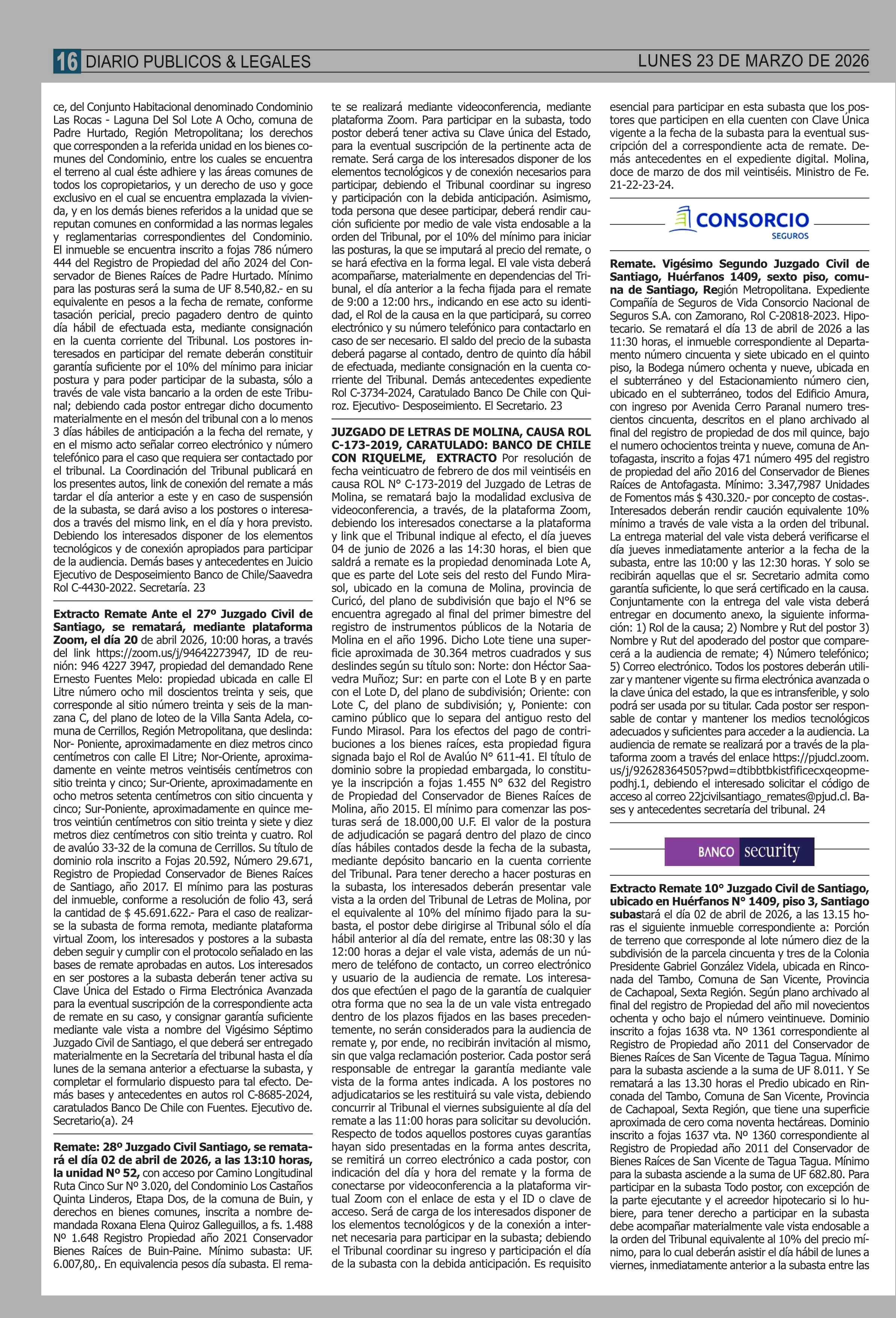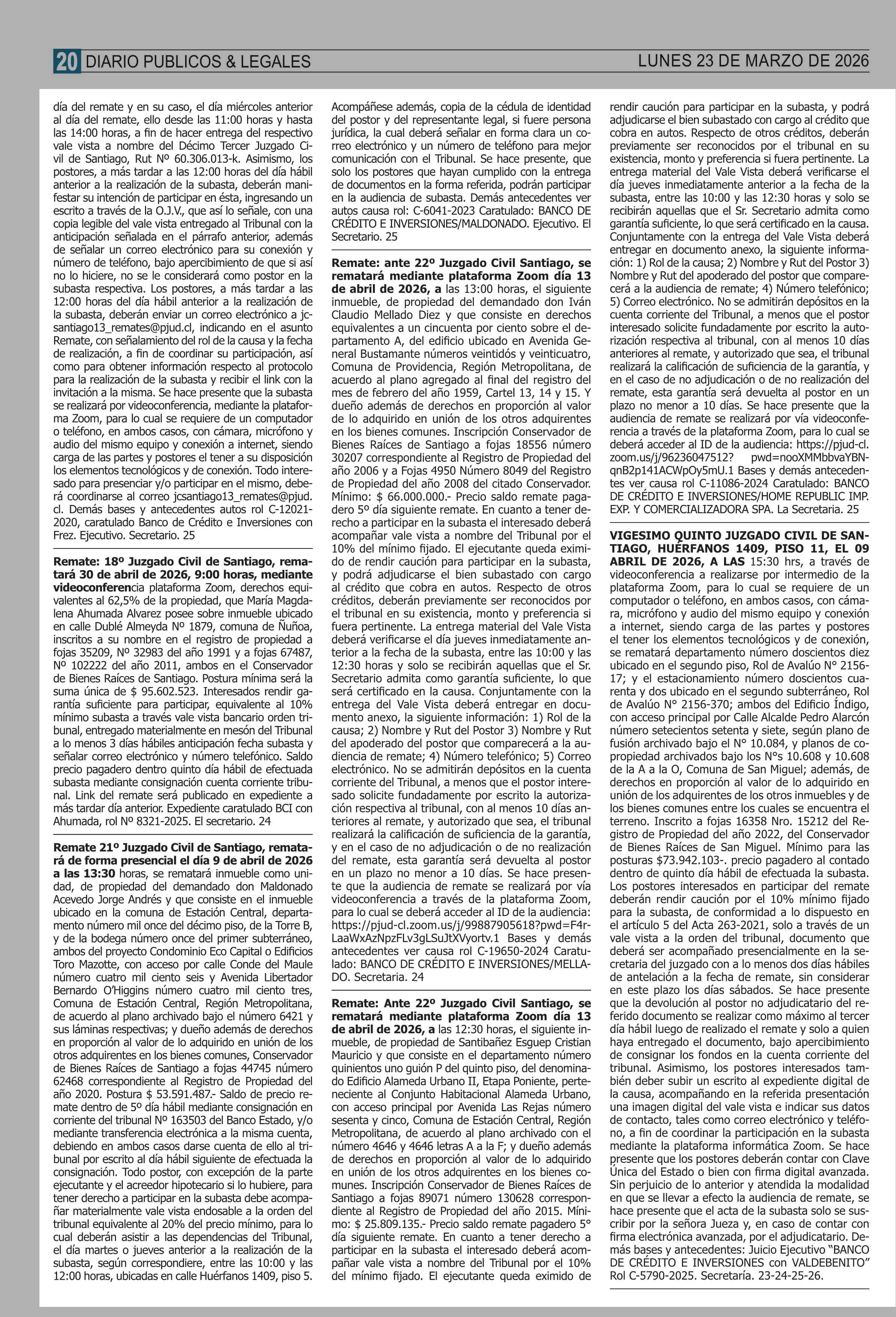 REMATES: COMPENDIO REMATES de PROPIEDADES (NACIONAL 23-03-2026 P&L Públicos y Legales |