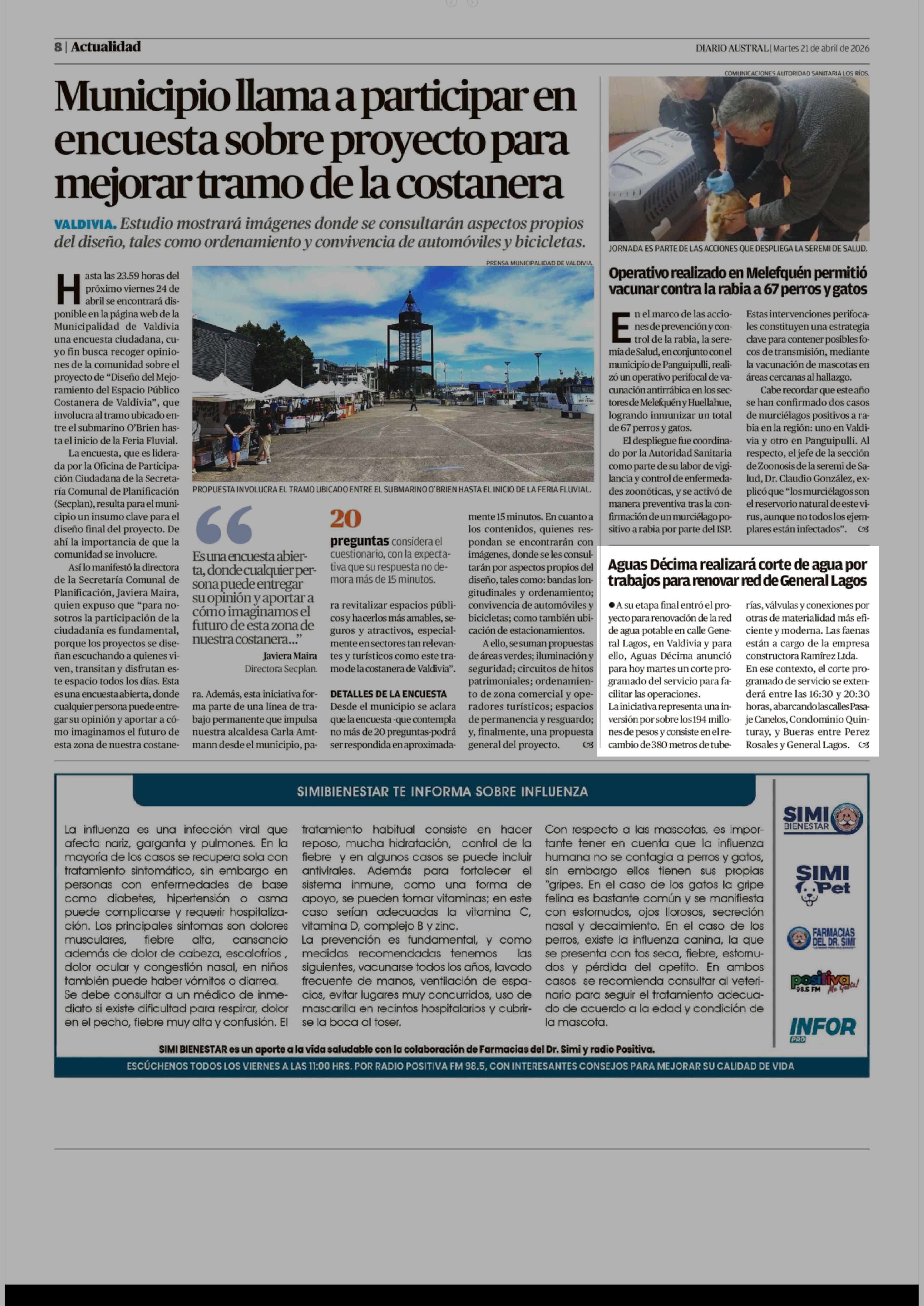 Aguas Décima realizará corte de agua por trabajos para renovar red de General Lagos 21-04-2026 Diario Austral Región de Los Ríos |