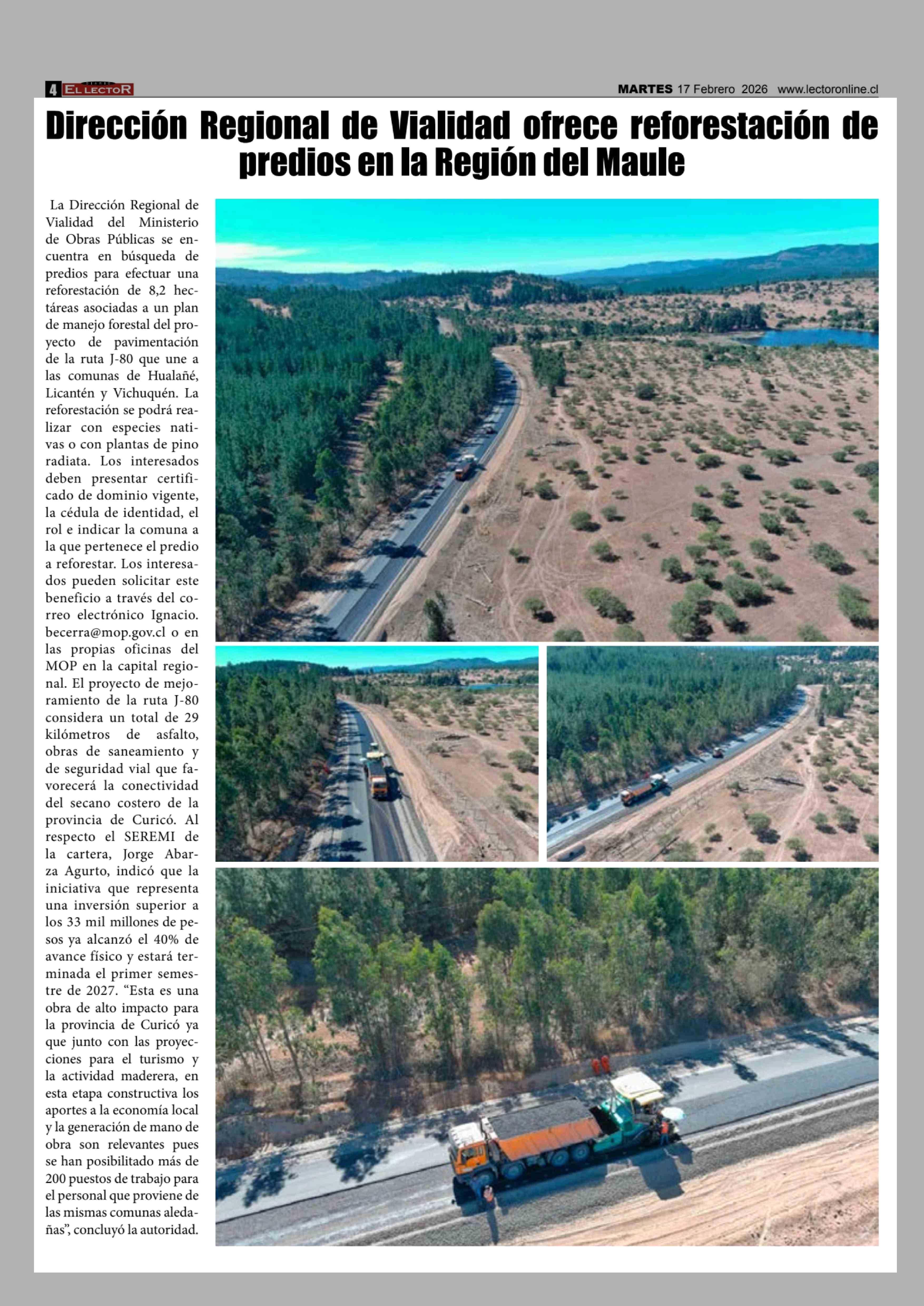 Dirección Regional de Vialidad ofrece reforestación de predios en la Región del Maule 18-02-2026 El Lector |