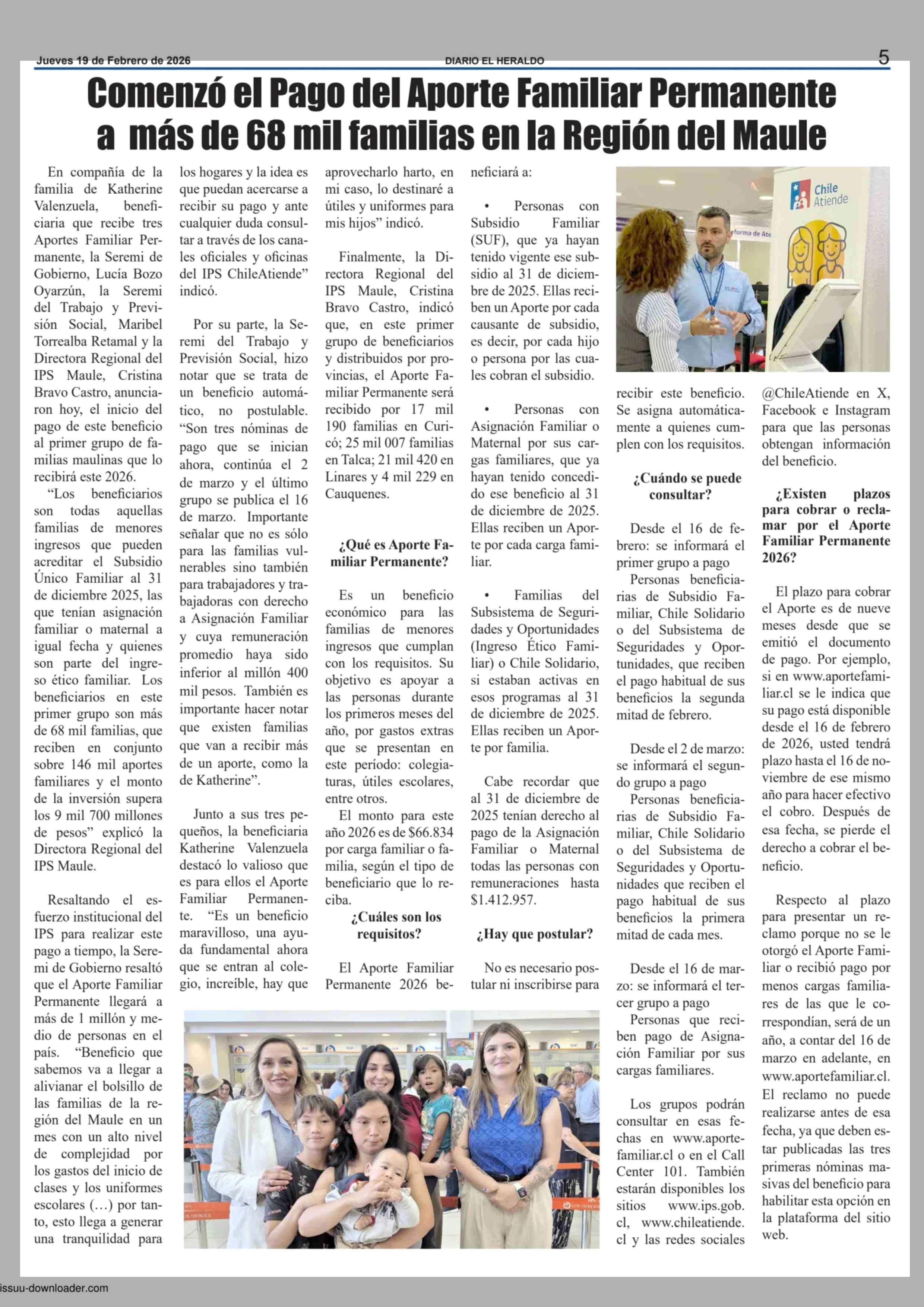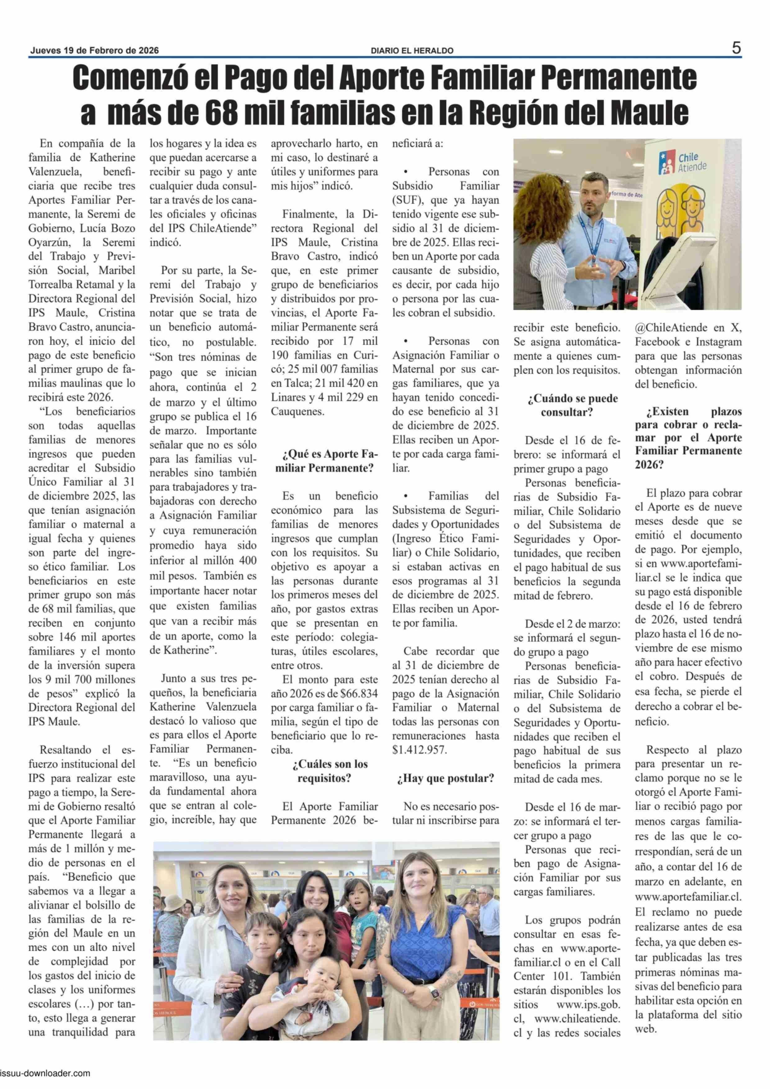 Comenzó el Pago del Aporte Familiar Permanente a más de 68 mil familias en la Región del Maule 19-02-2026 El Heraldo |