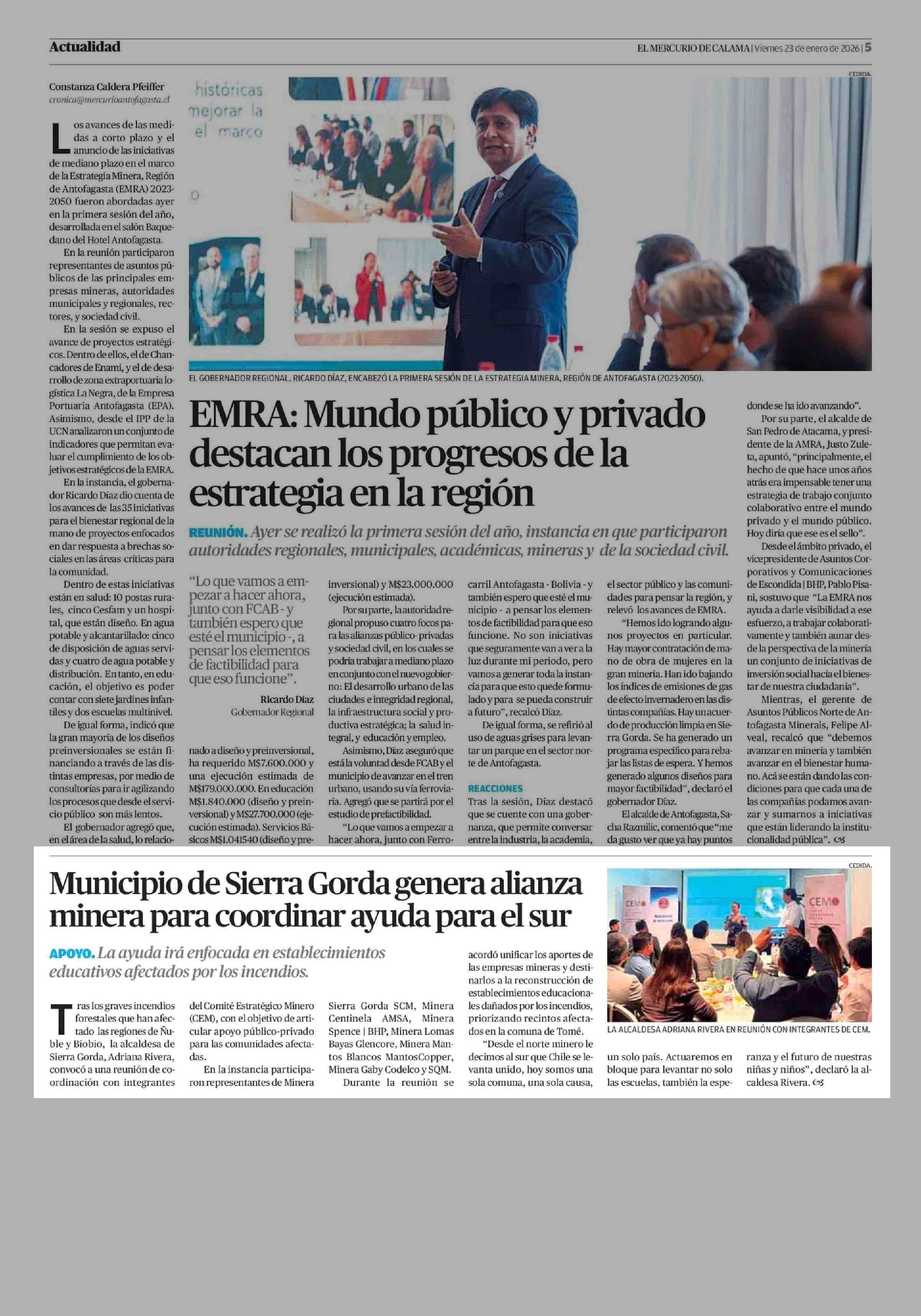 Municipio de Sierra Gorda genera alianza minera para coordinar ayuda para el sur 23-01-2026 El Mercurio de Calama |