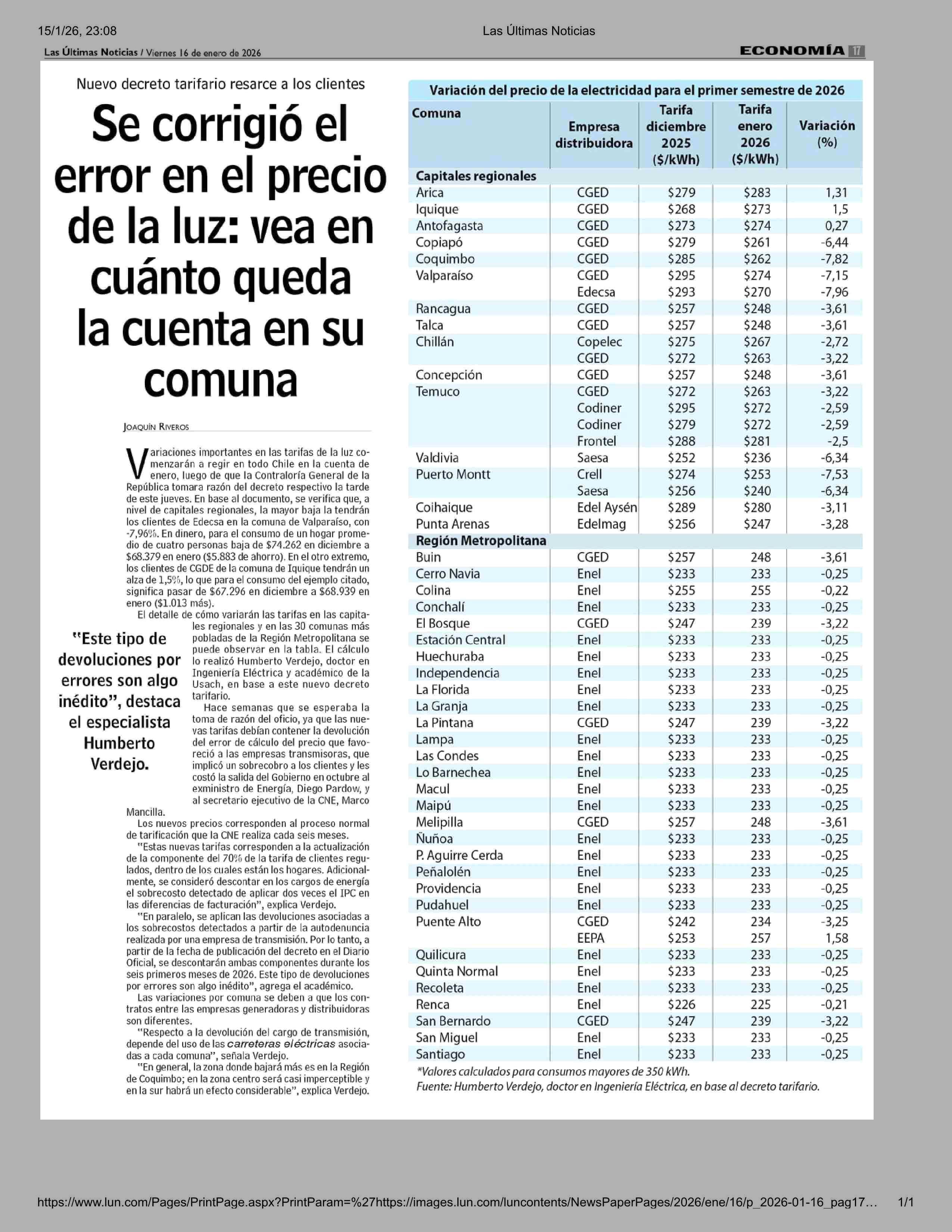 Se corrigió el error en el precio de la luz: vea en cuánto queda la cuenta en su comuna 16-01-2026 Las Últimas Noticias |
