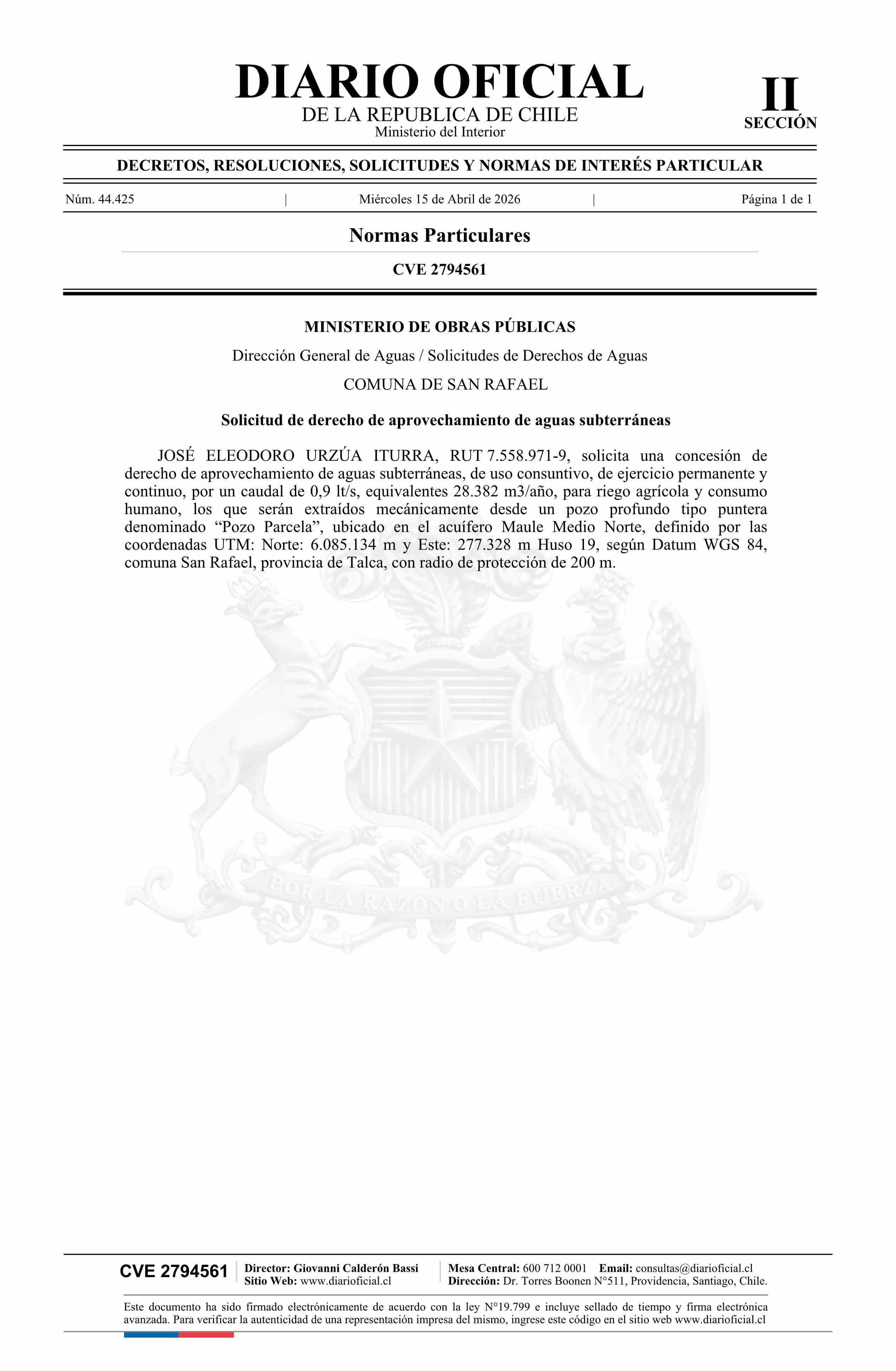 Solicitud Urzúa Iturra José Eleodoro 15-04-2026 Diario Oficial Edición Electrónica |