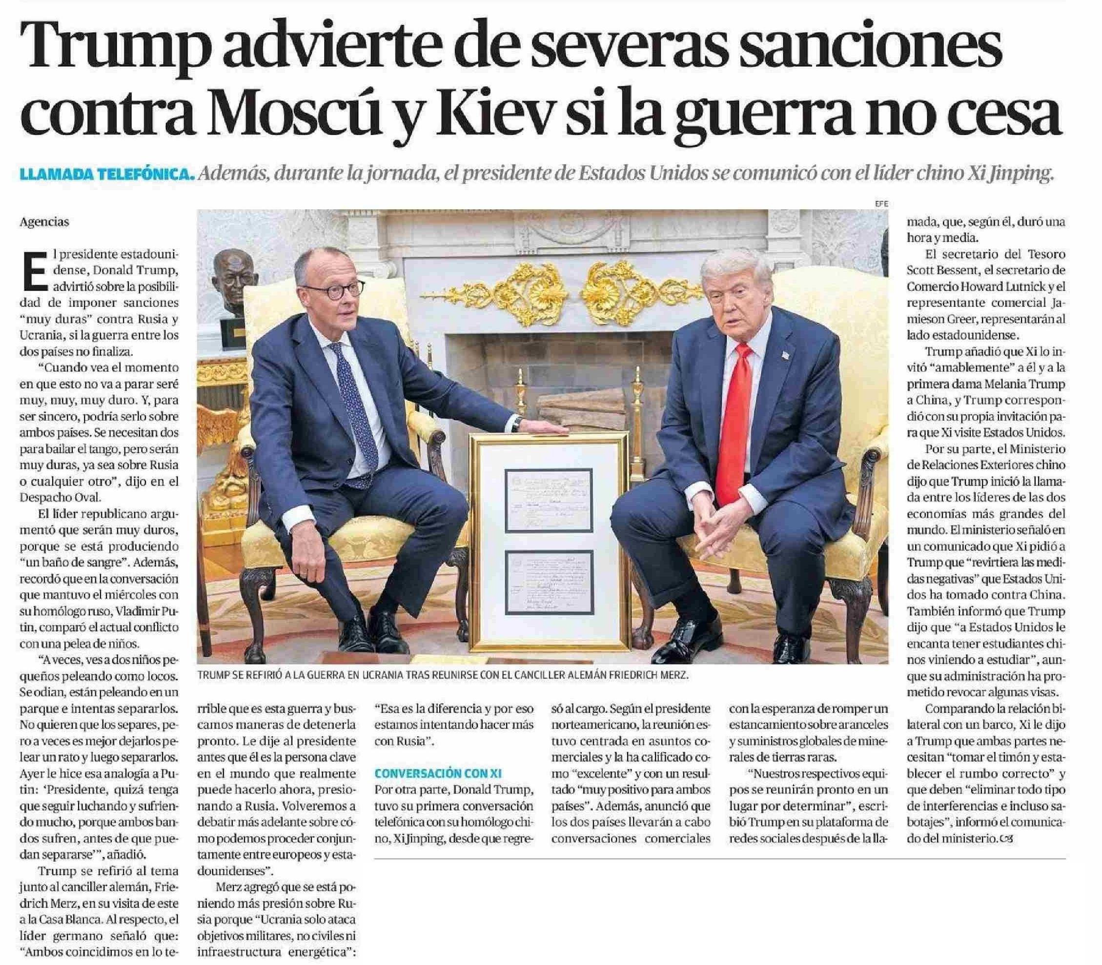 Trump advierte de severas sanciones contra Moscú y Kiev si la guerra no cesa 06-06-2025 El Mercurio de Antofagasta |