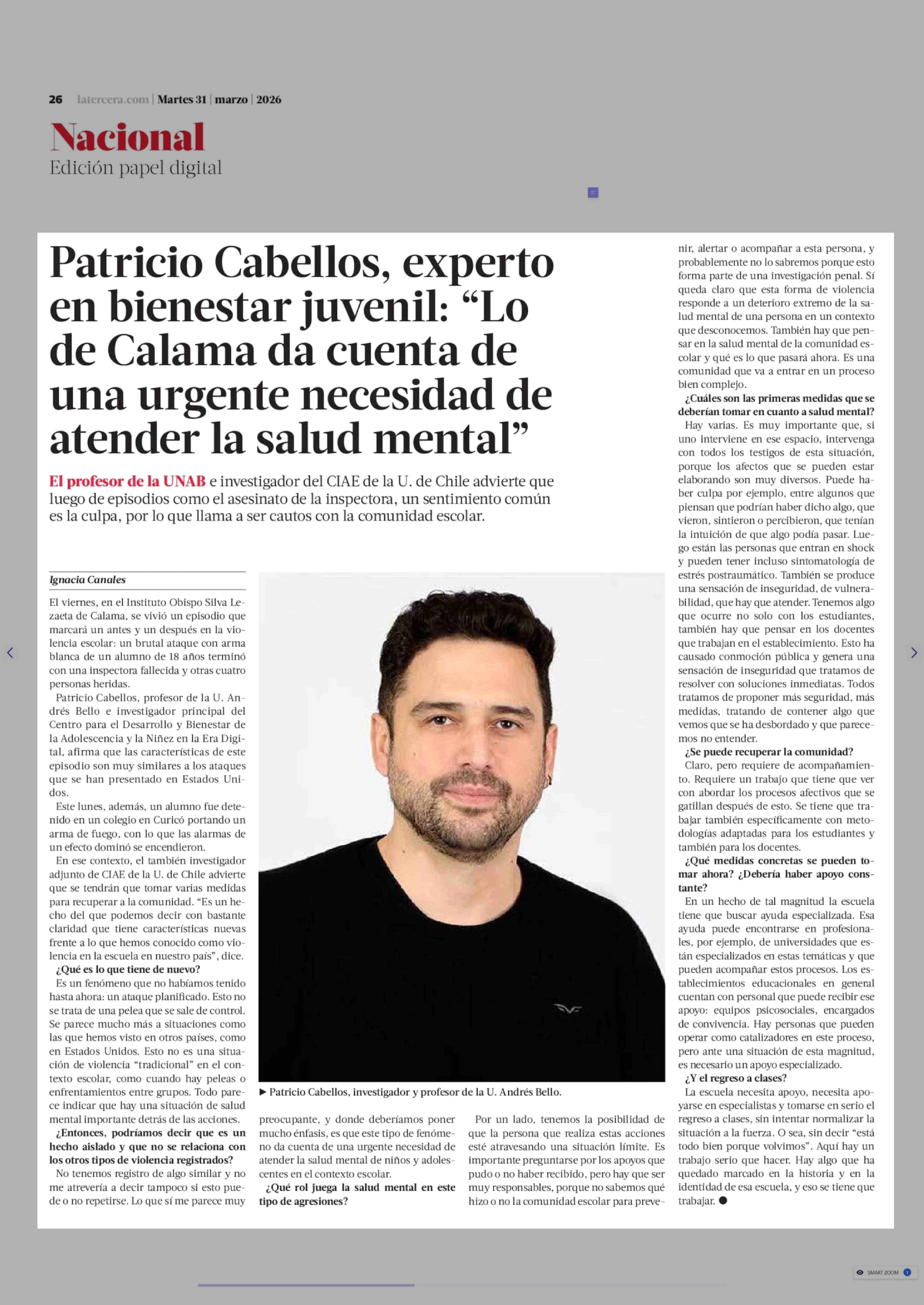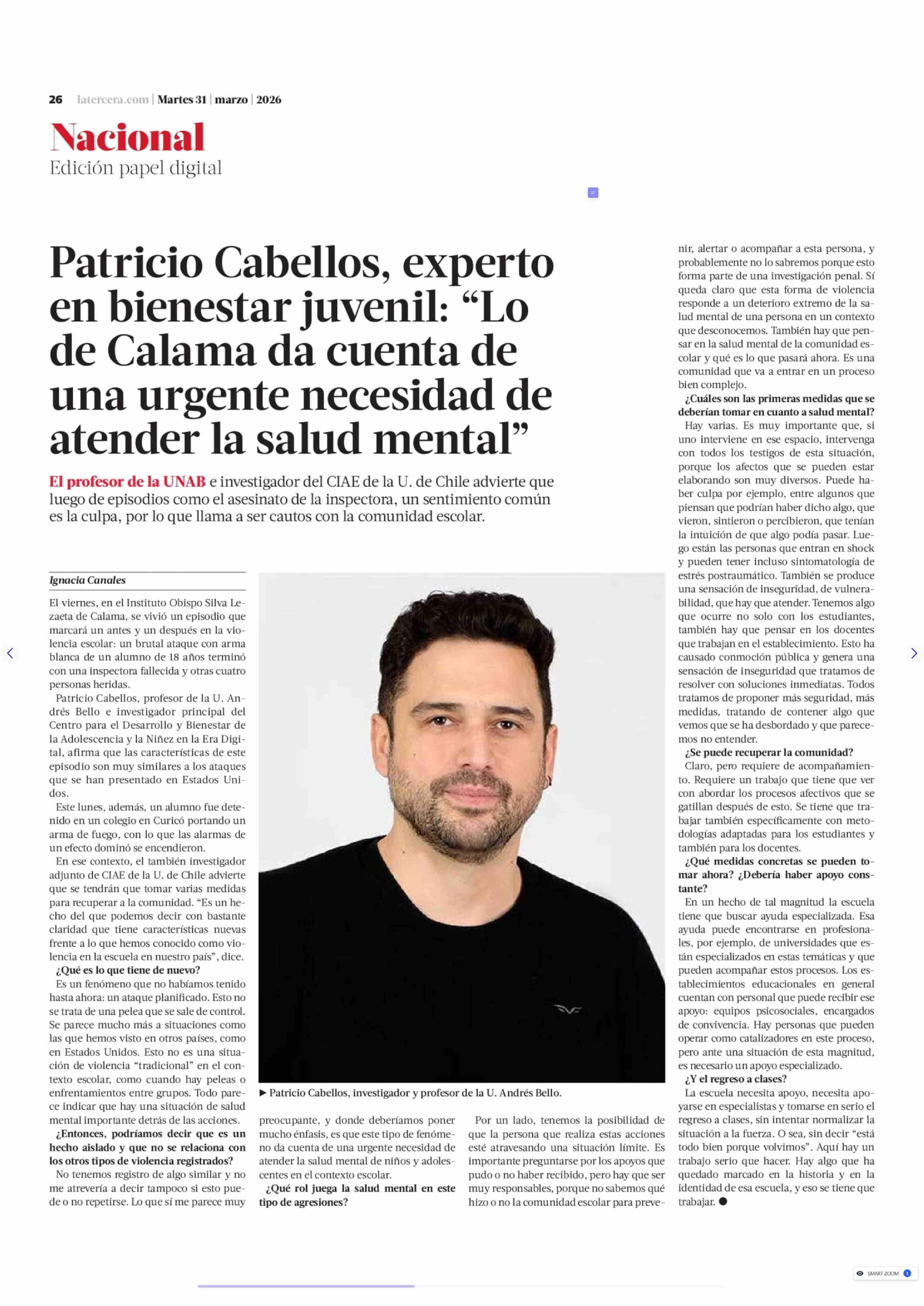 Patricio Cabellos, experto en bienestar juvenil: "Lo de Calama da cuenta de una urgente necesidad de atender la salud mental" 31-03-2026 La Tercera |