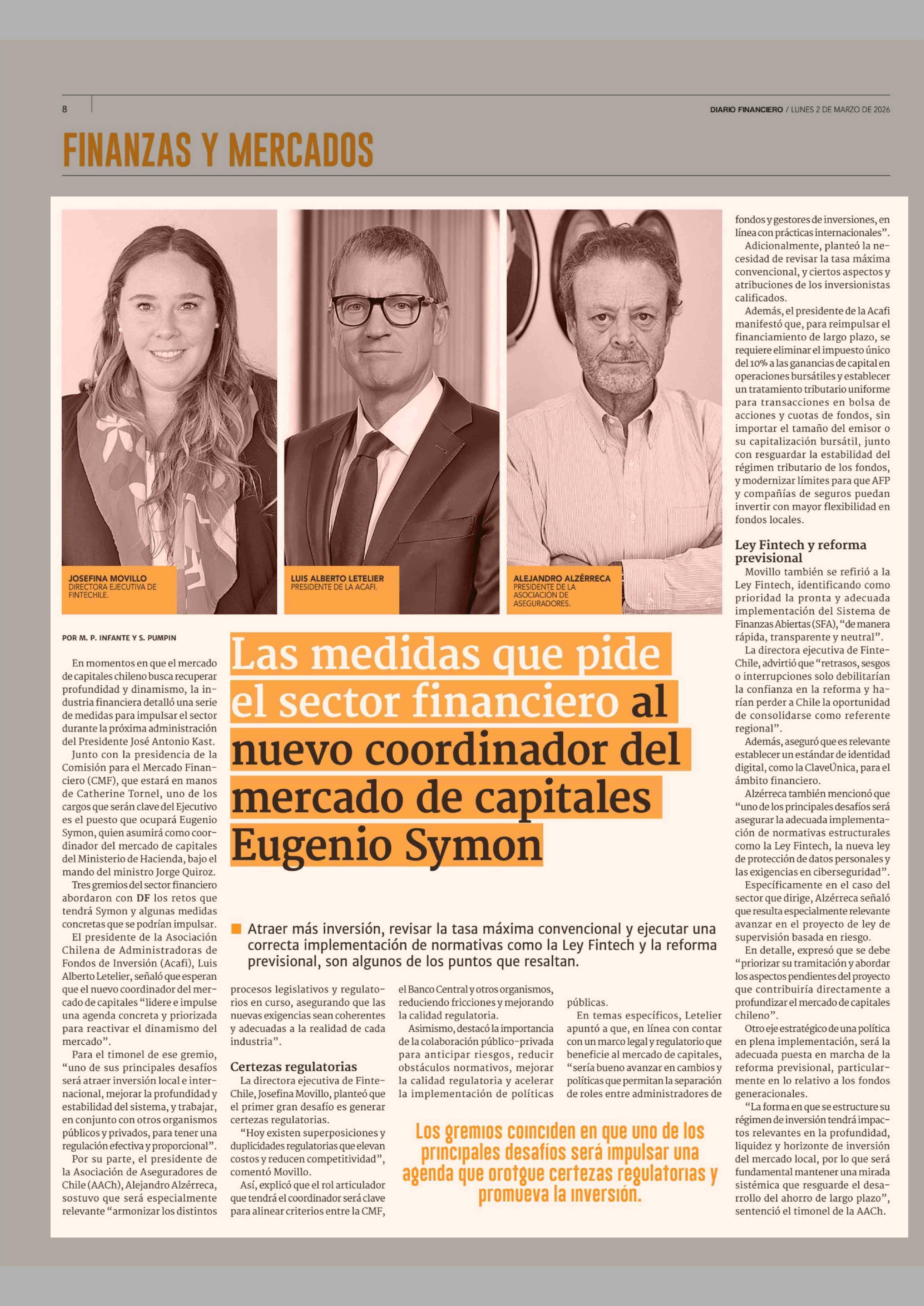 Las medidas que pide el sector financiero al nuevo coordinador del mercado de capitales Eugenio Symon 02-03-2026 Diario Financiero |