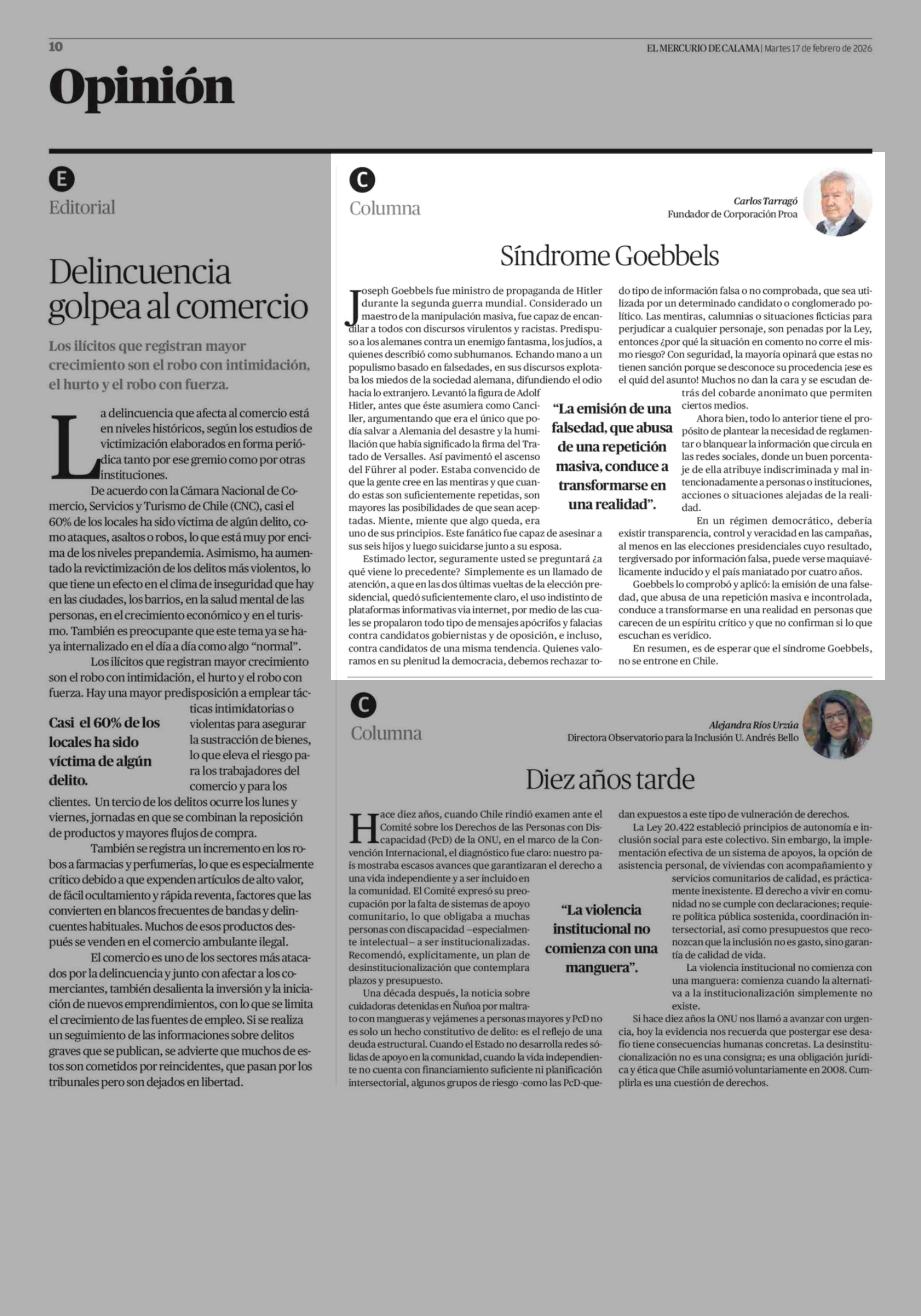 Columnas de Opinión: Síndrome Goebbels 17-02-2026 El Mercurio de Calama |