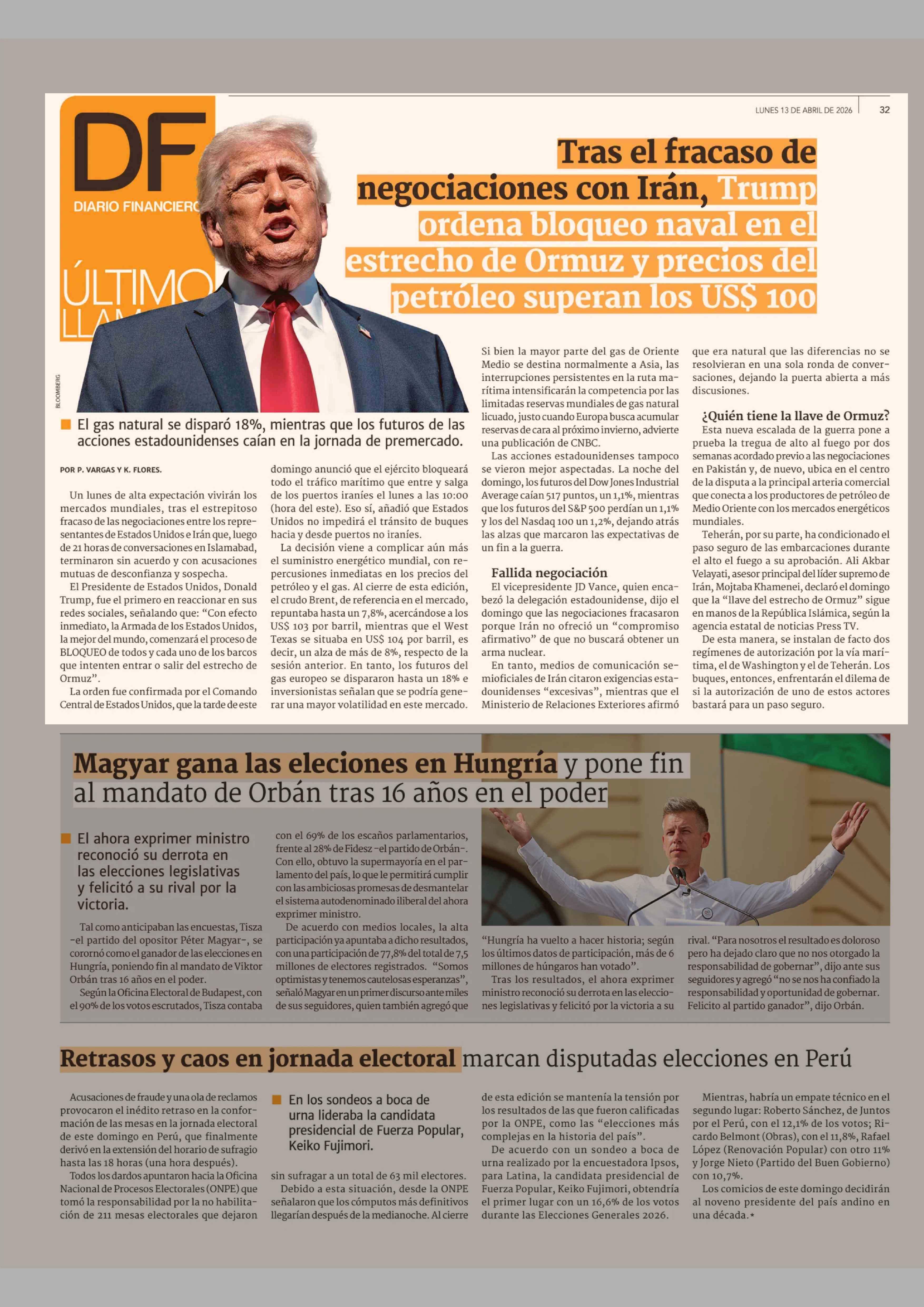 Tras el fracaso de negociaciones con Irán, Trump ordena bloqueo naval en el estrecho de Ormuz y precios del petróleo superan los US$ 100 13-04-2026 Diario Financiero |
