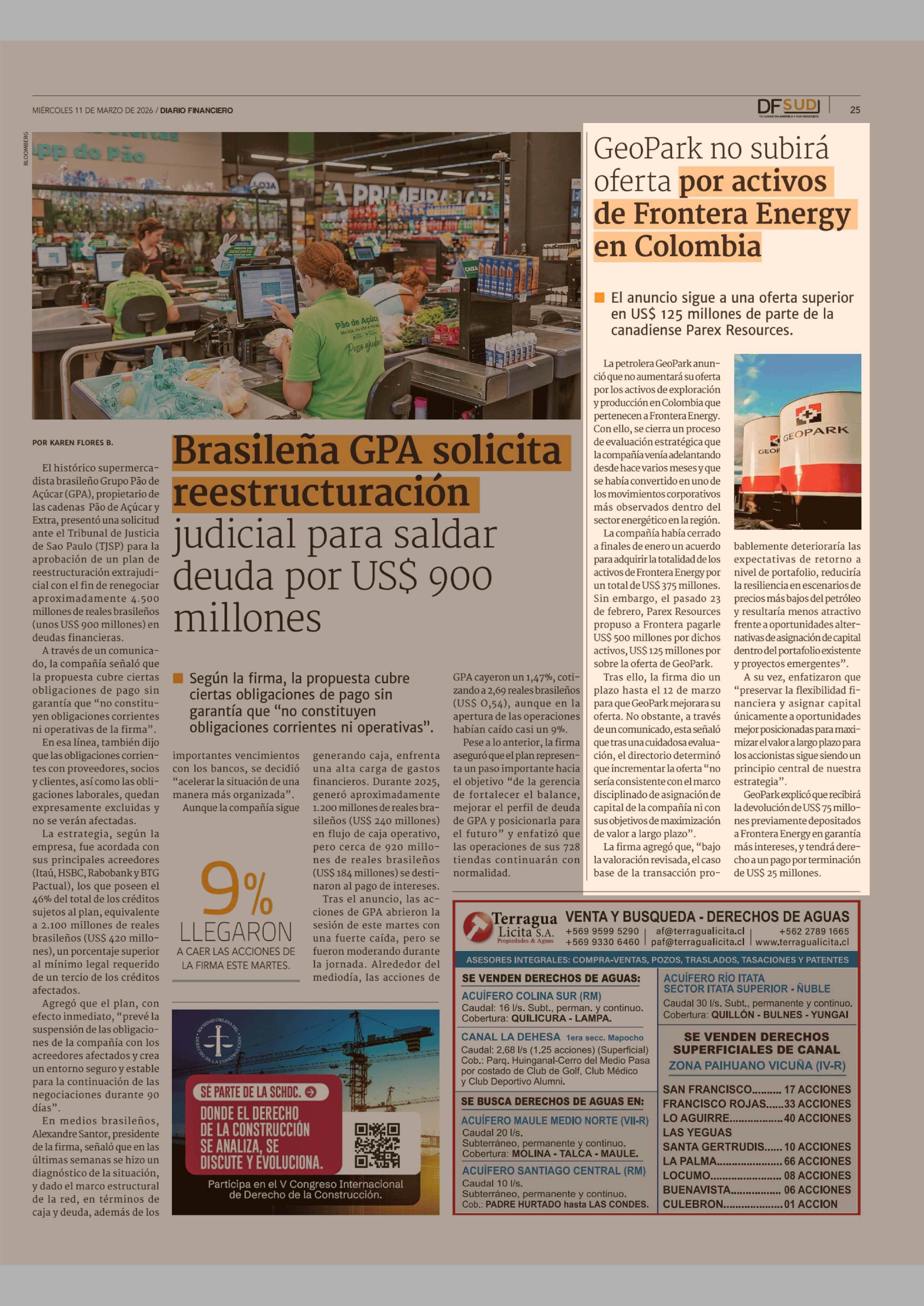 GeoPark no subirá oferta por activos de Frontera Energy en Colombia 11-03-2026 Diario Financiero |
