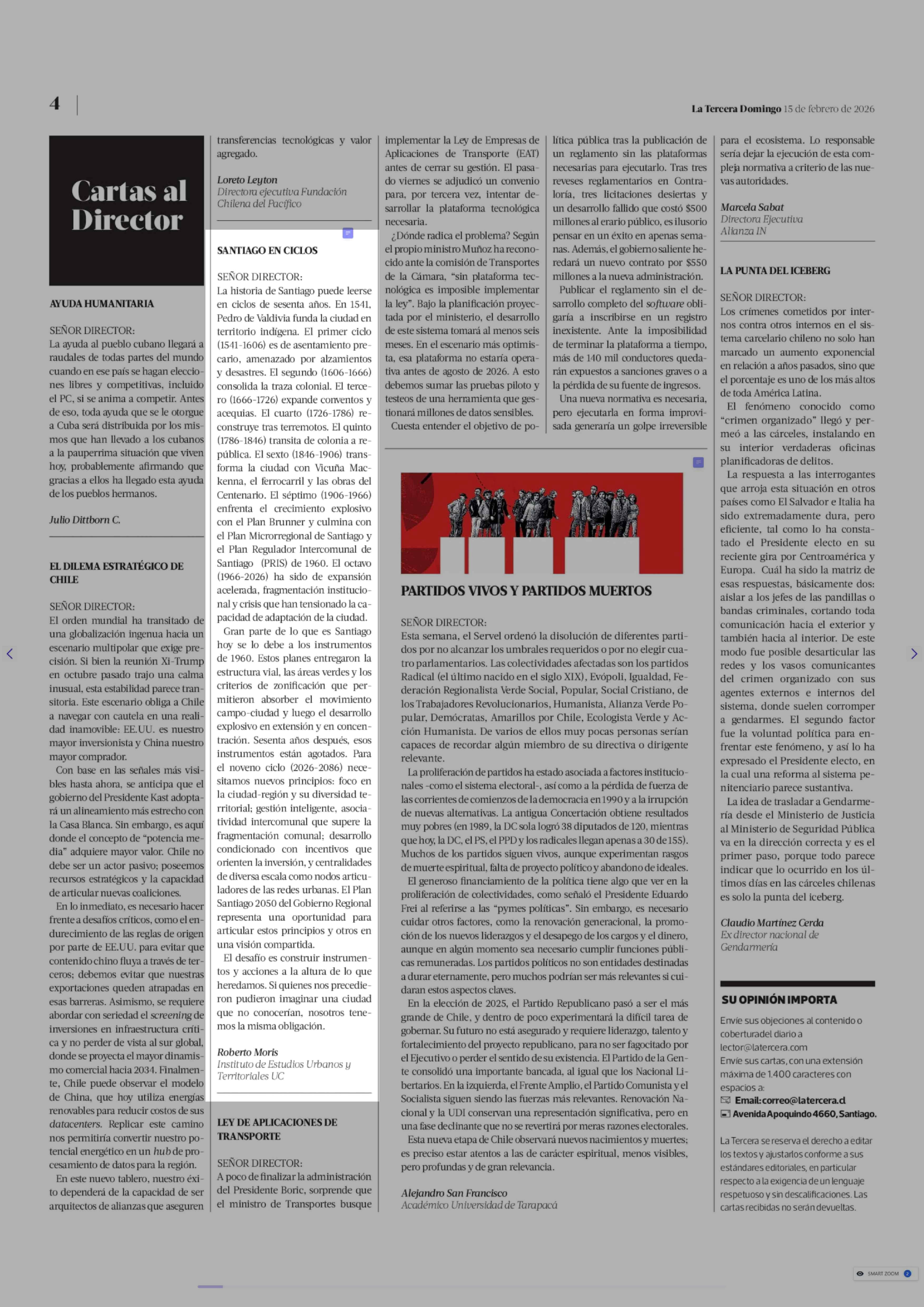 CARTAS: SANTIAGO EN CICLOS 15-02-2026 La Tercera |