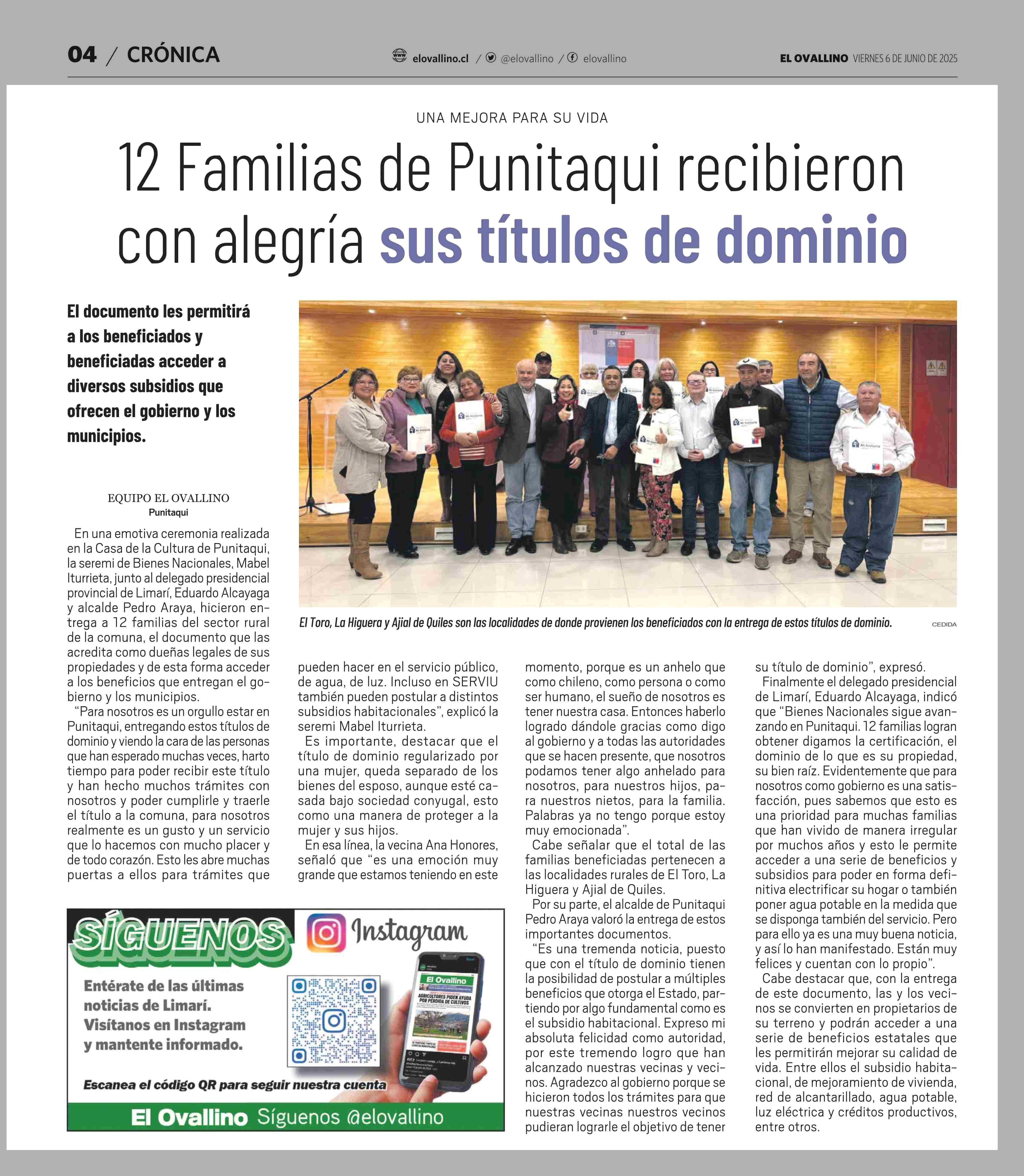 12 Familias de Punitaqui recibieron con alegría sus títulos de dominio 06-06-2025 El Ovallino |