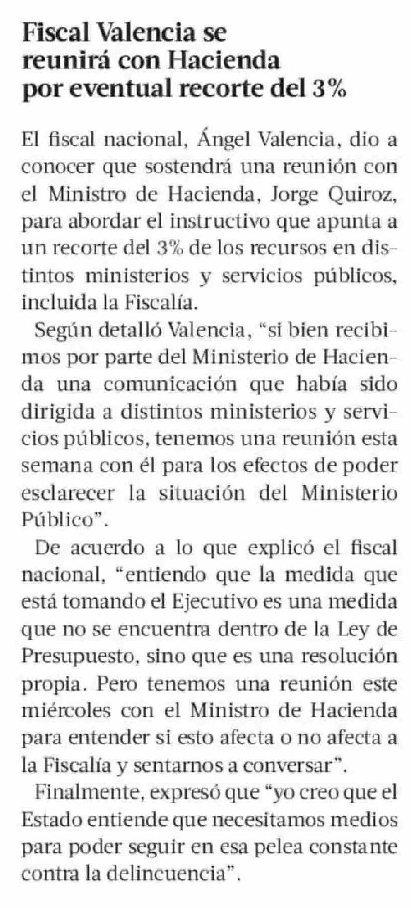 | Título: | Fiscal Valencia se reunirá con Hacienda por eventual recorte del 3% |