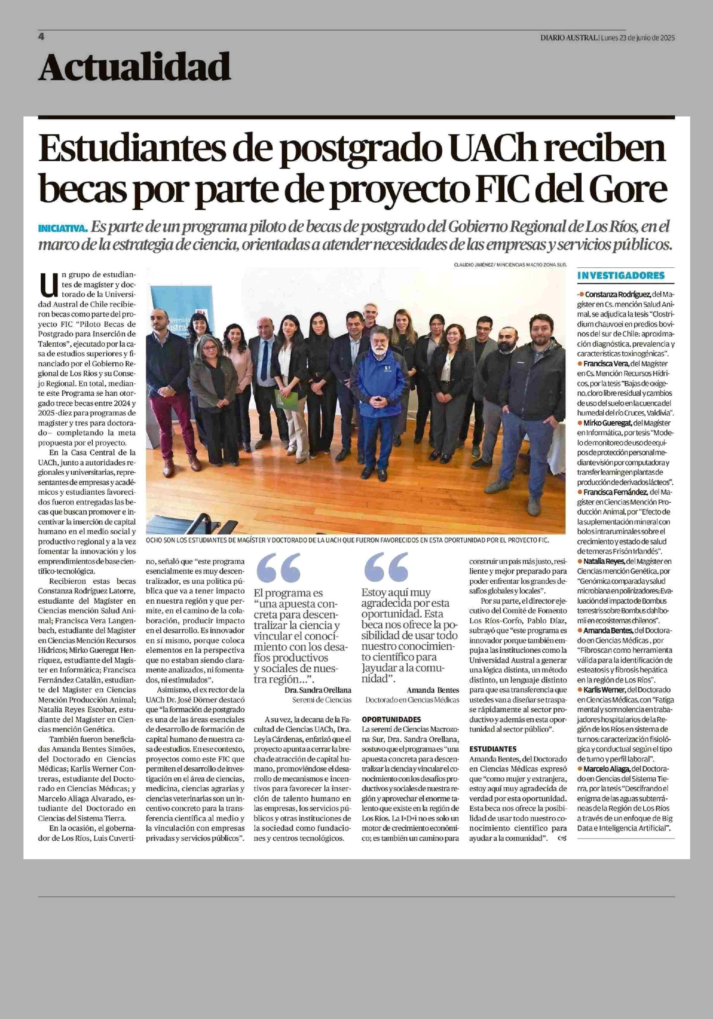 Estudiantes de postgrado UACh reciben becas por parte de proyecto FIC del Gore 23-06-2025 Diario Austral Región de Los Ríos |