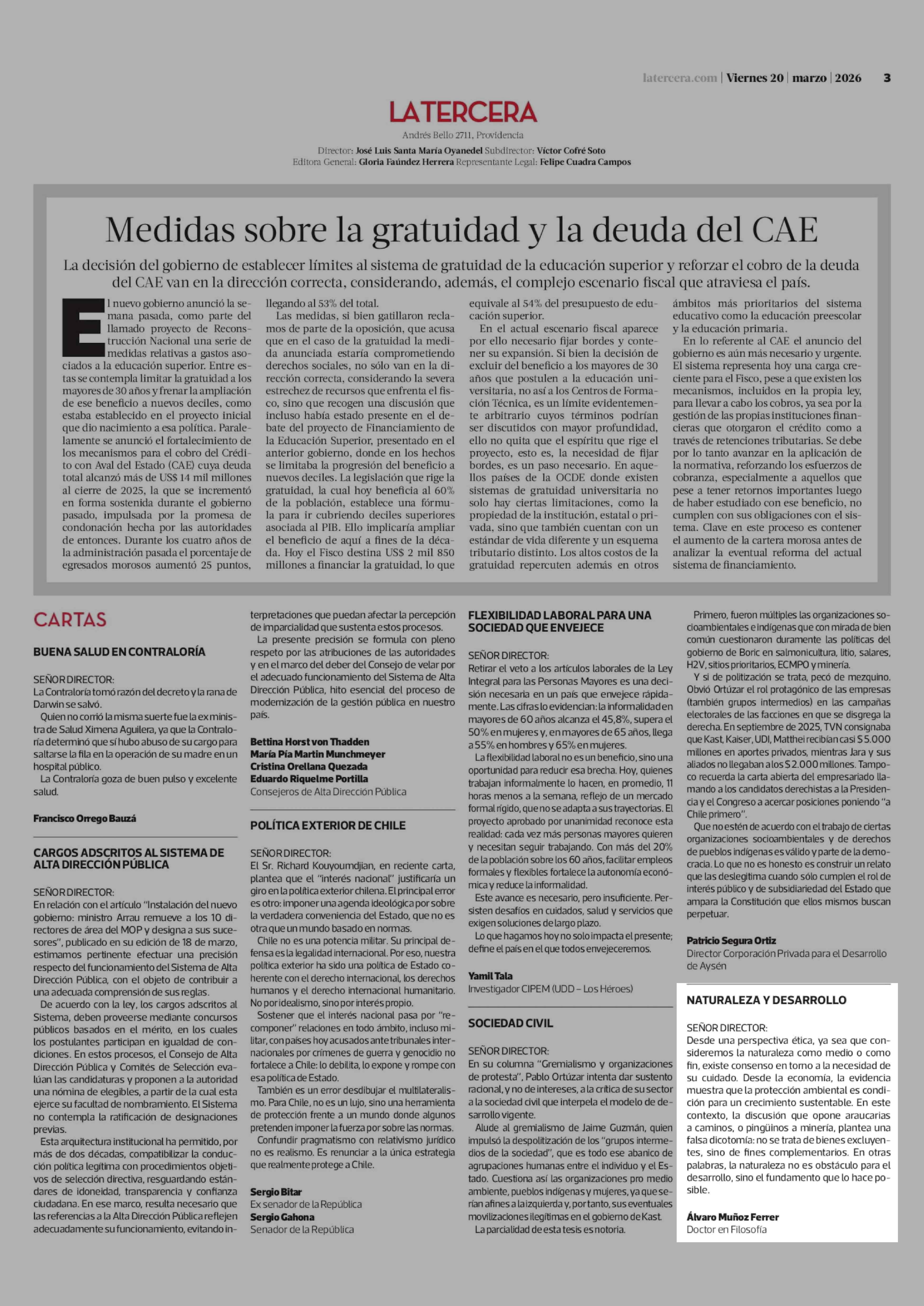 Cartas: NATURALEZA Y DESARROLLO 20-03-2026 La Tercera |
