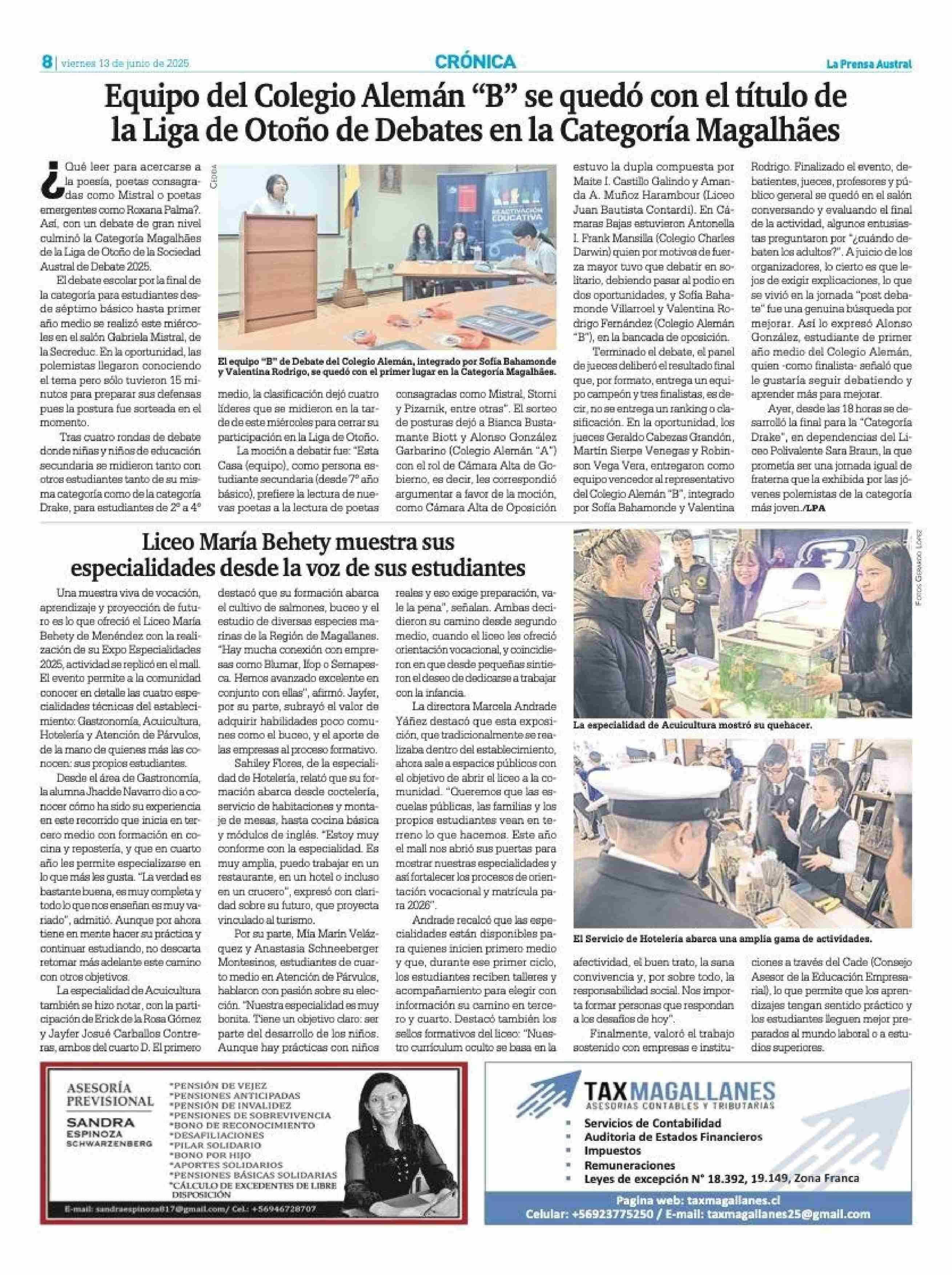 Liceo María Behety muestra sus especialidades desde la voz de sus estudiantes 13-06-2025 La Prensa Austral |