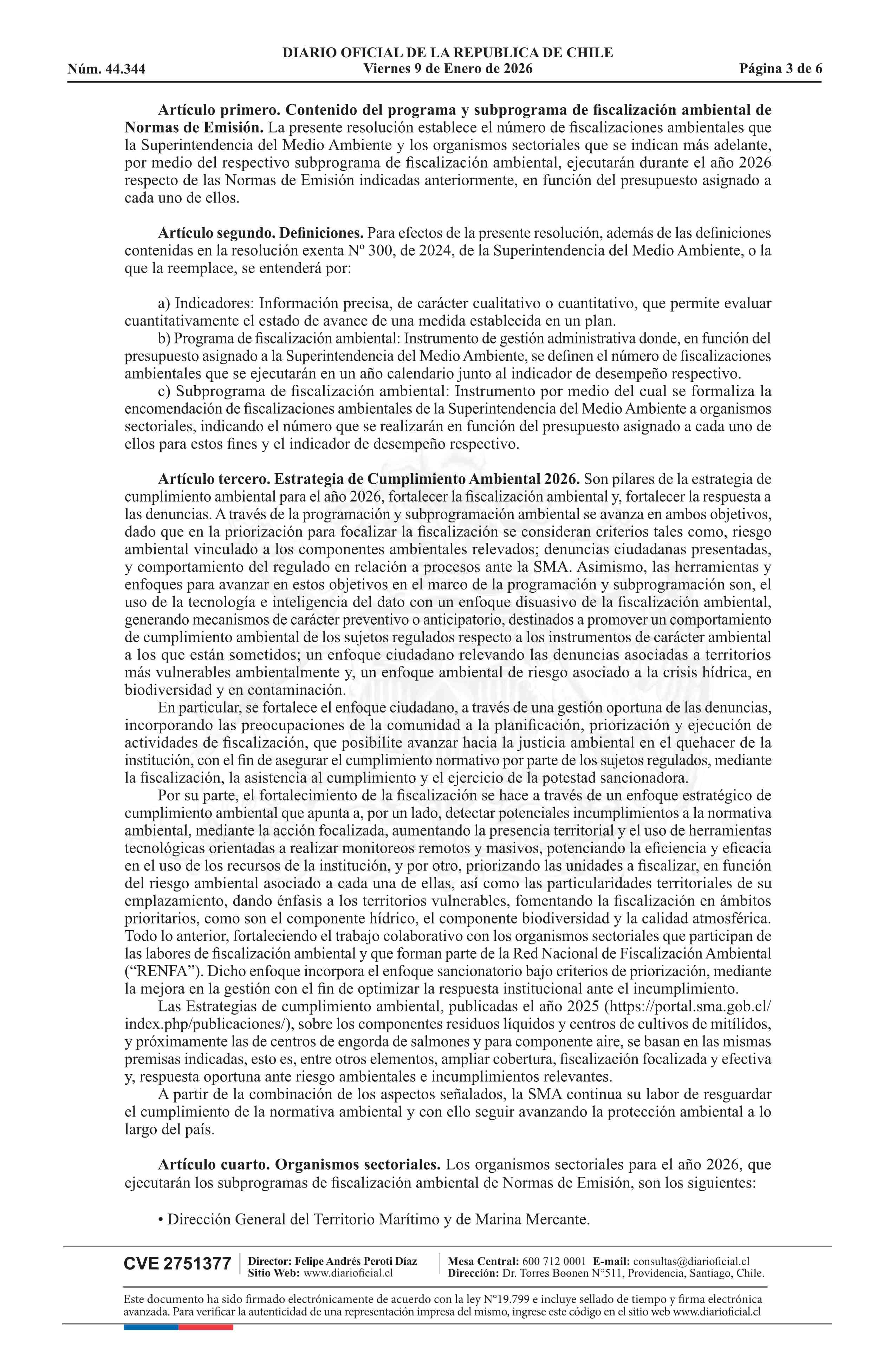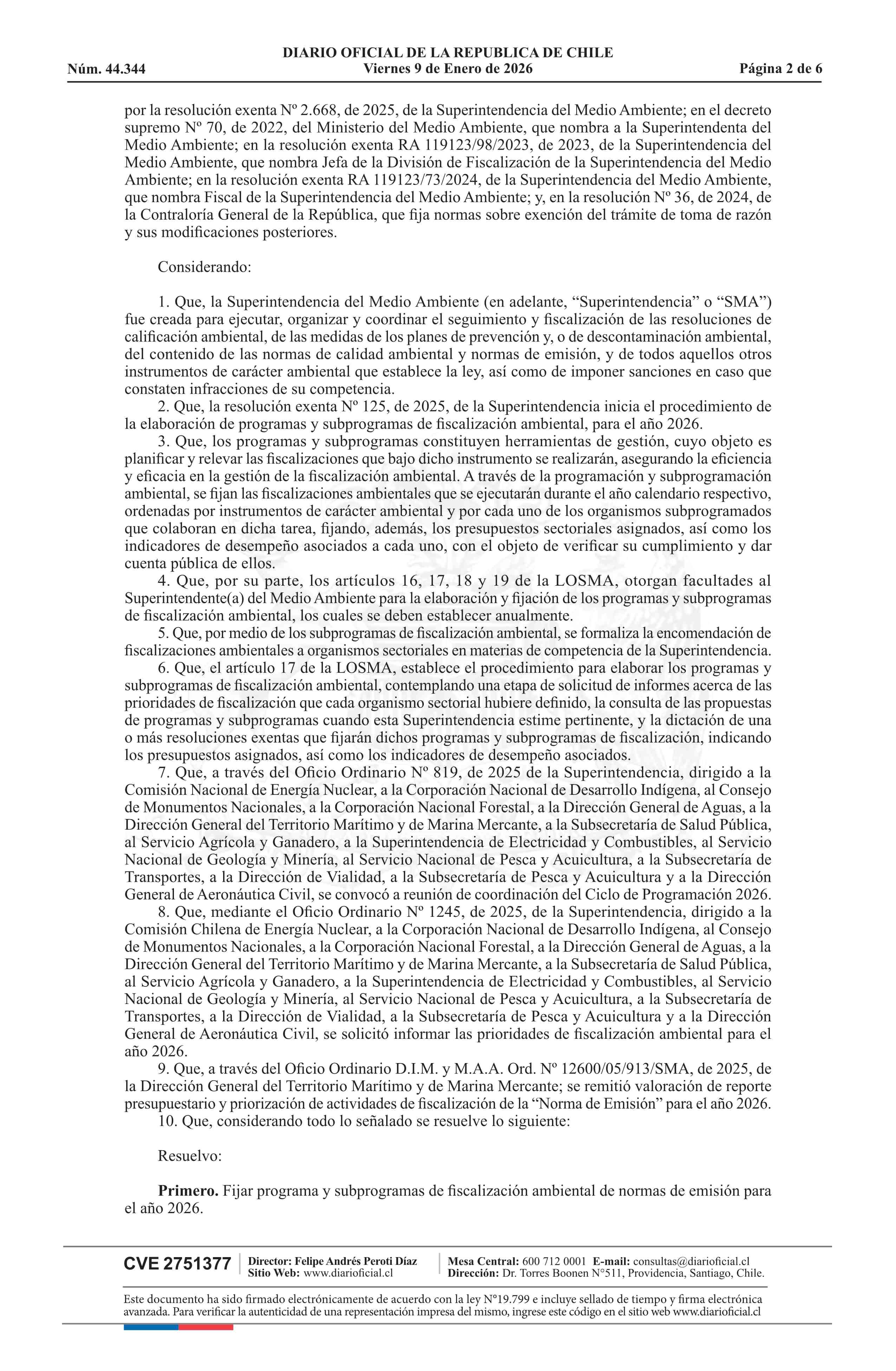 Resolución exenta número 2.996, de 2025.- Fija programa y subprograma de fiscalización ambiental de normas de emisión para el año 2026 09-01-2026 Diario Oficial Edición Electrónica |