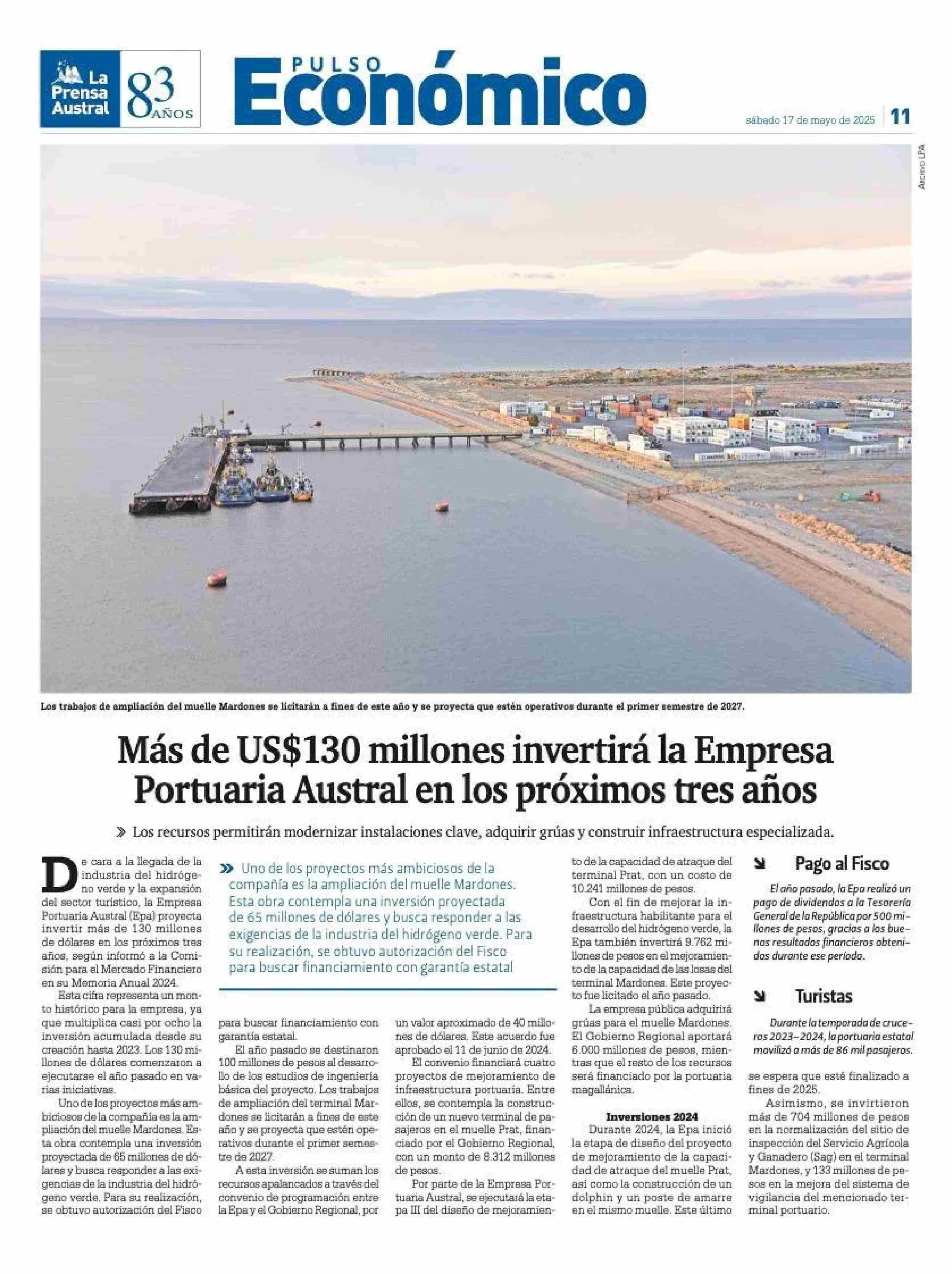 Más de US$130 millones invertirá la Empresa Portuaria Austral en los próximos tres años 17-05-2025 La Prensa Austral |