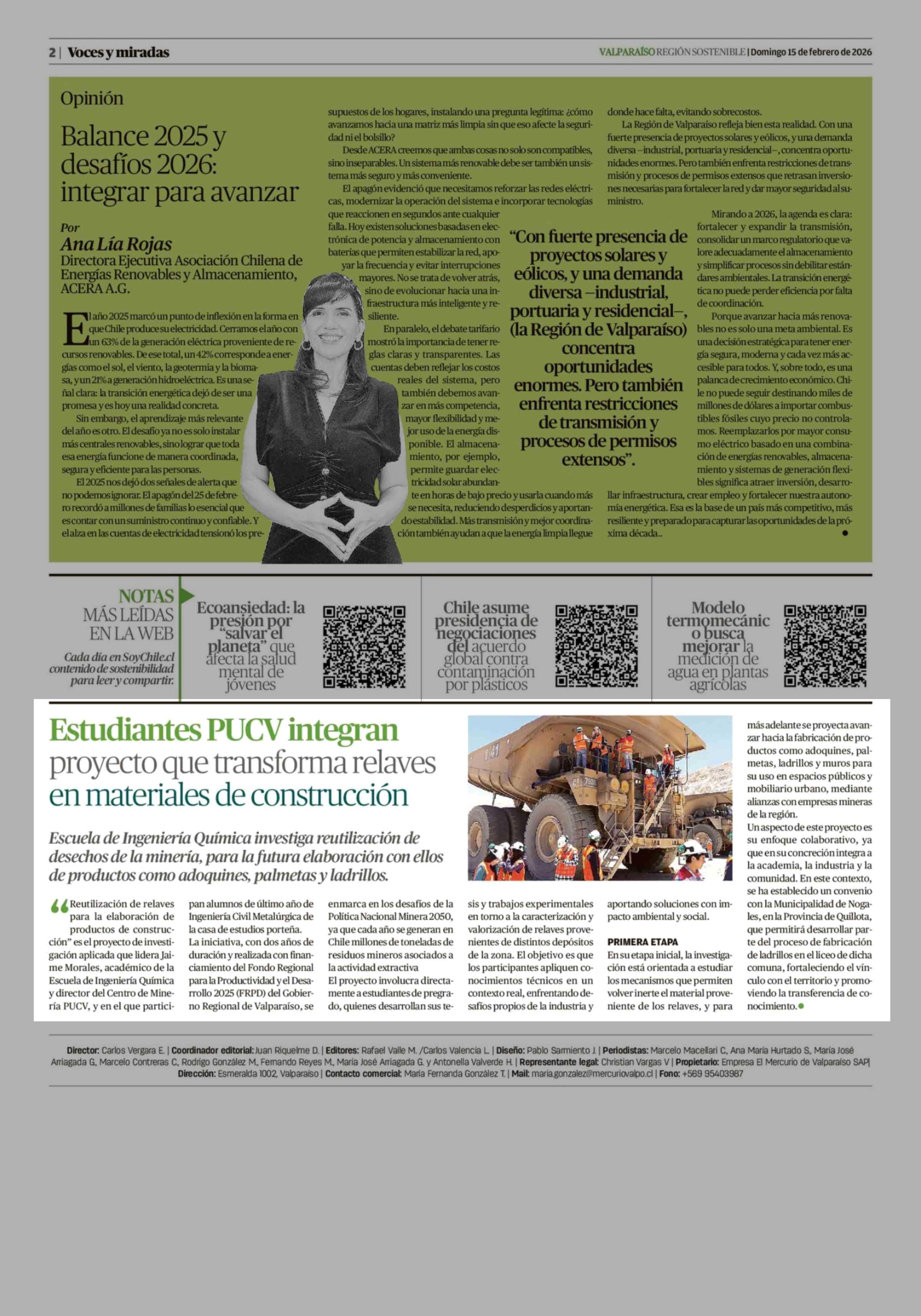 Estudiantes PUCV integran proyecto que transforma relaves en materiales de construcción 15-02-2026 El Mercurio de Valparaíso |