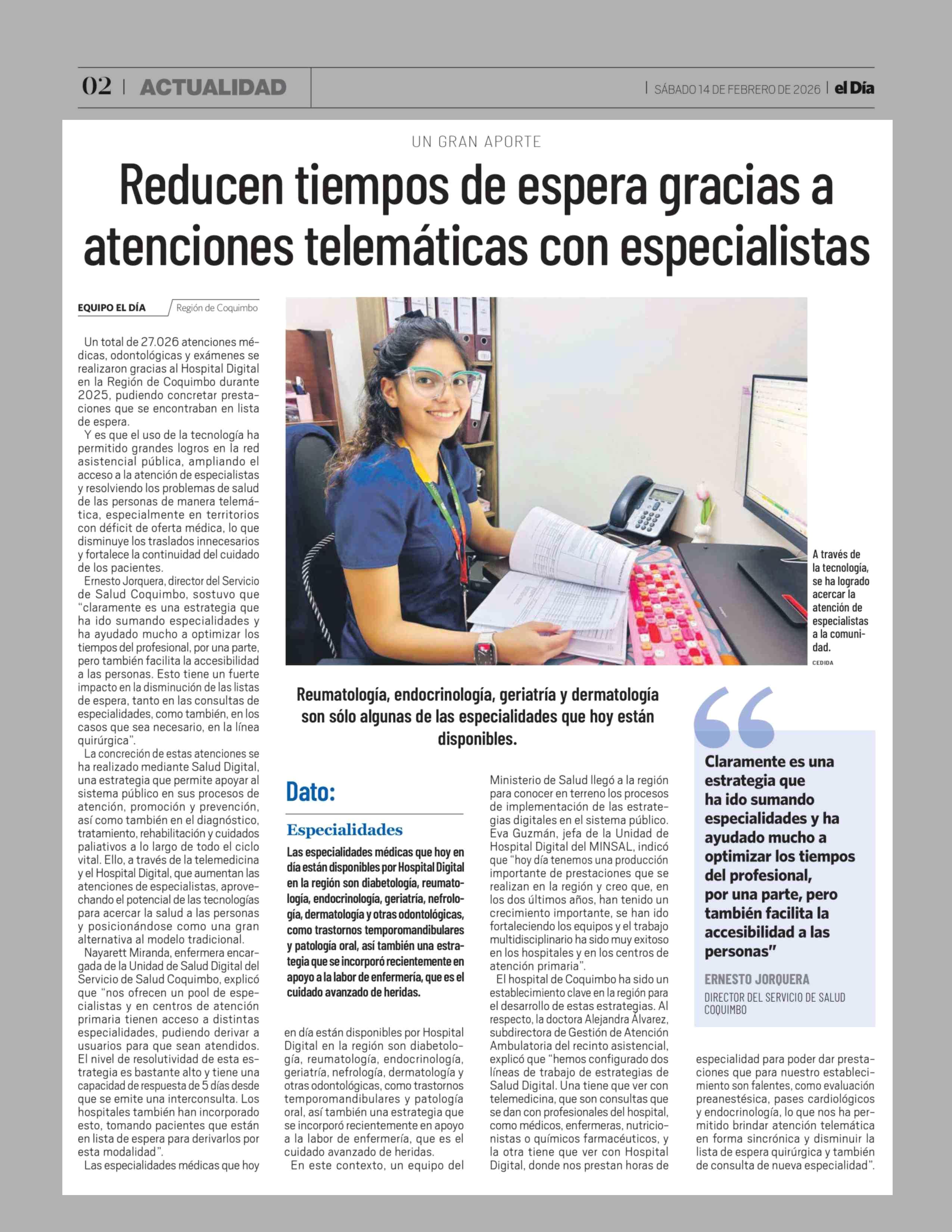 Reducen tiempos de espera gracias a atenciones telemáticas con especialistas 14-02-2026 El Día |