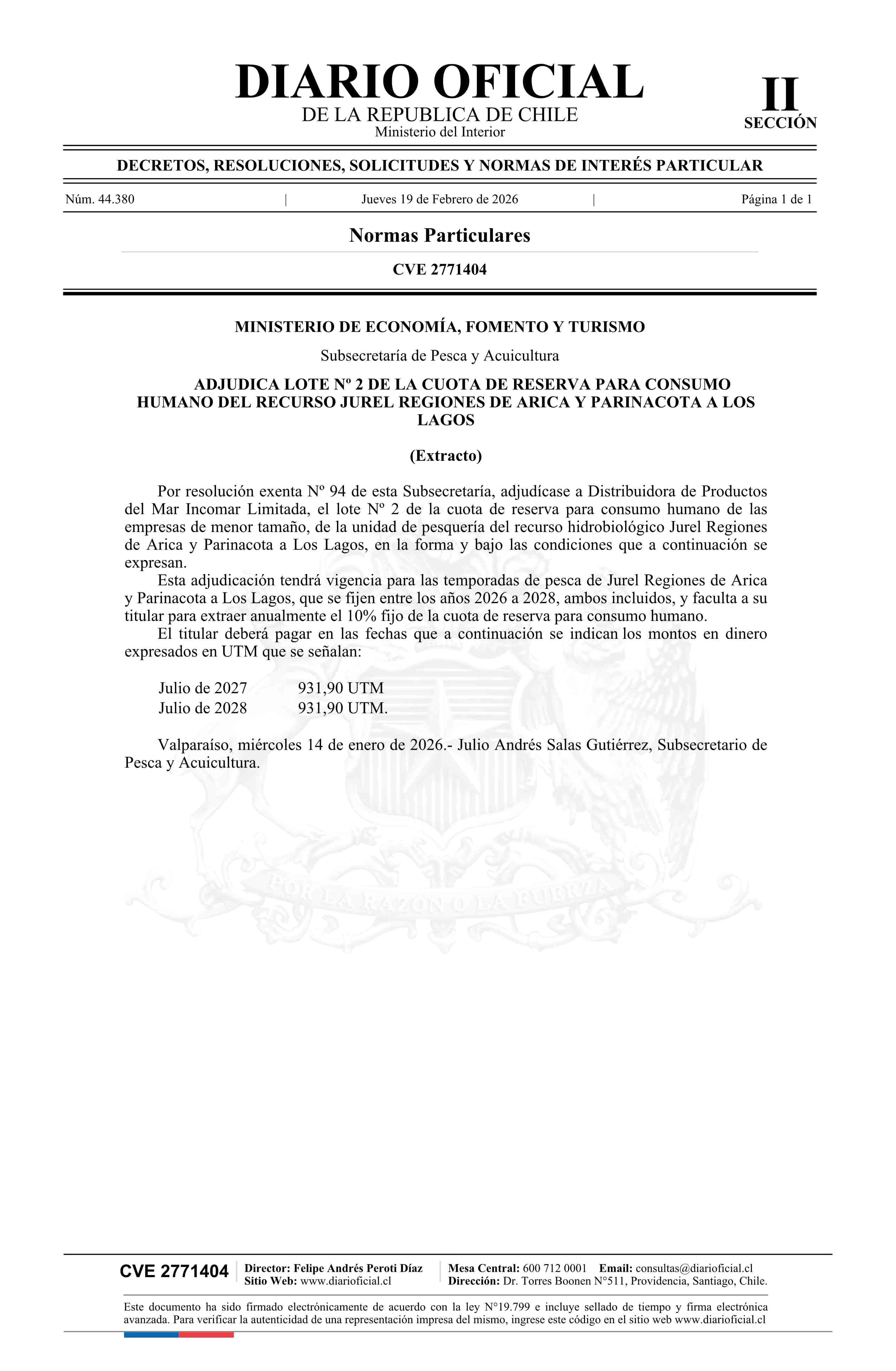 Título: Extracto de resolución exenta número 94, de 2026.- Adjudica lote Nº 2 de la cuota de reserva para consumo humano del recurso jurel regiones de Arica y Parinacota a Los Lagos