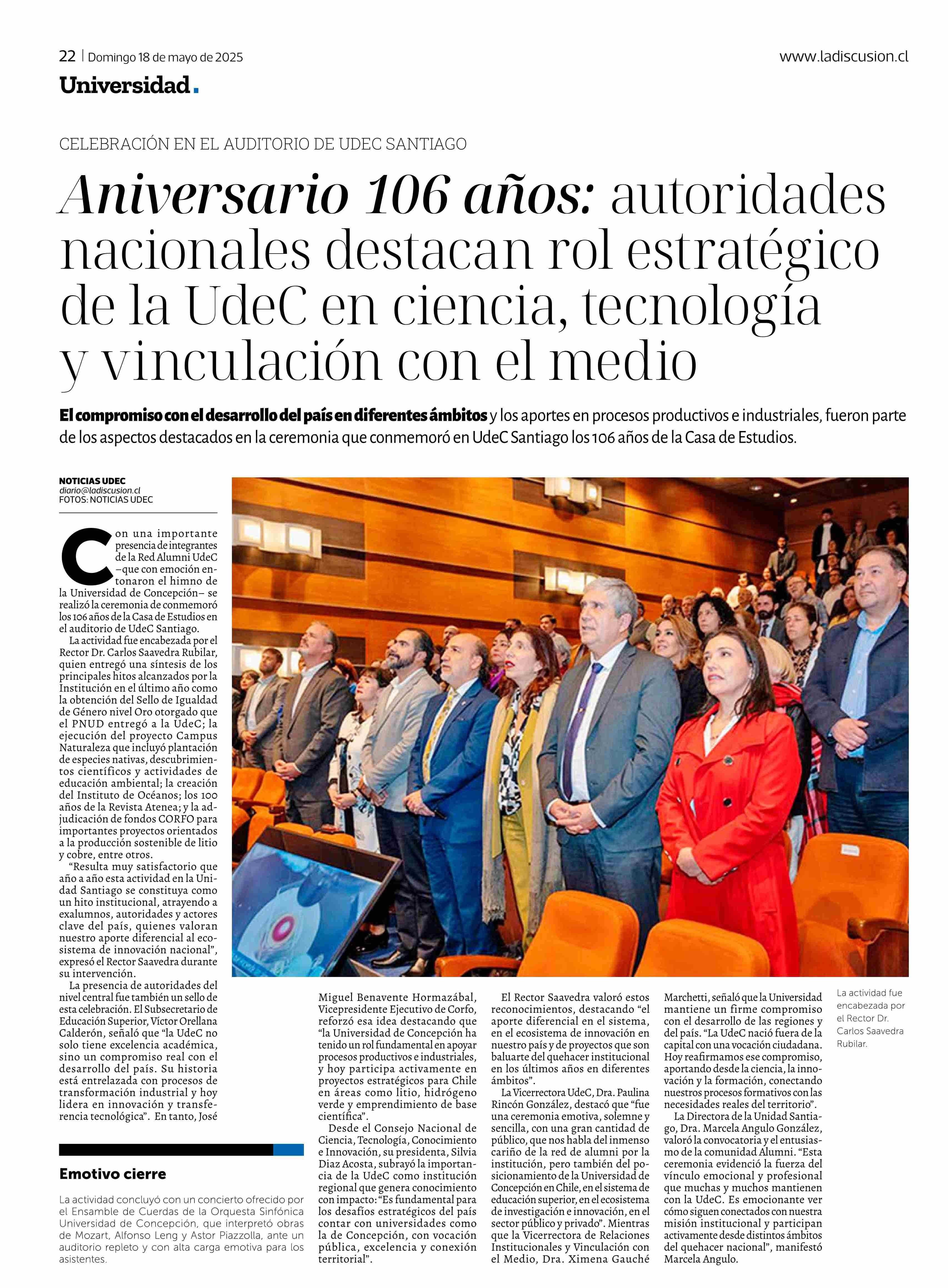 Antersario 106 años: autoridades nacionales destacan rol estratégico de la UdeC en ciencia, tecnologia v vinculación con el medio 18-05-2025 La Discusión |