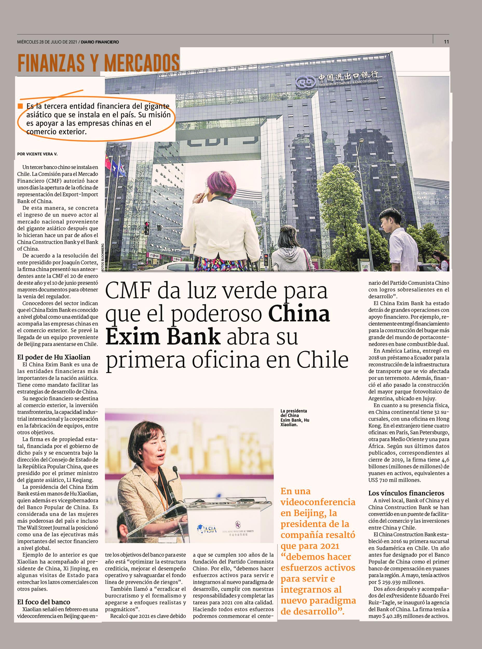 CMF da luz verde para que el poderoso China Exim Bank abra su primera oficina en Chile 28-07-2021 Diario Financiero |