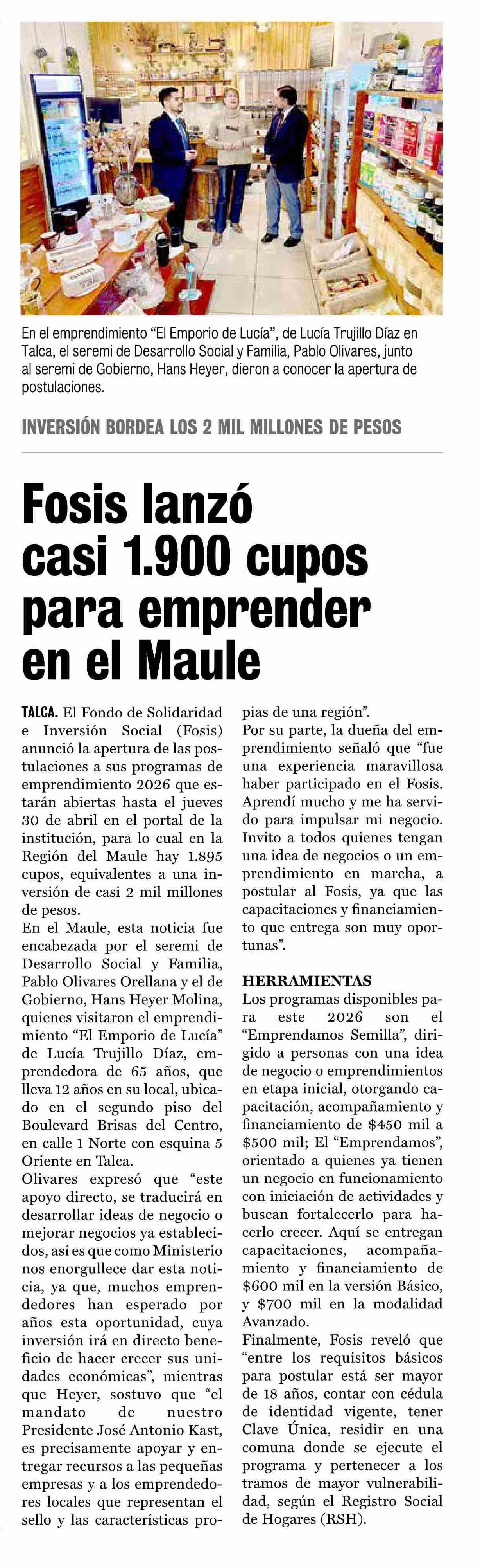 Título: Fosis lanzó casi 1.900 cupos para emprender en el Maule
