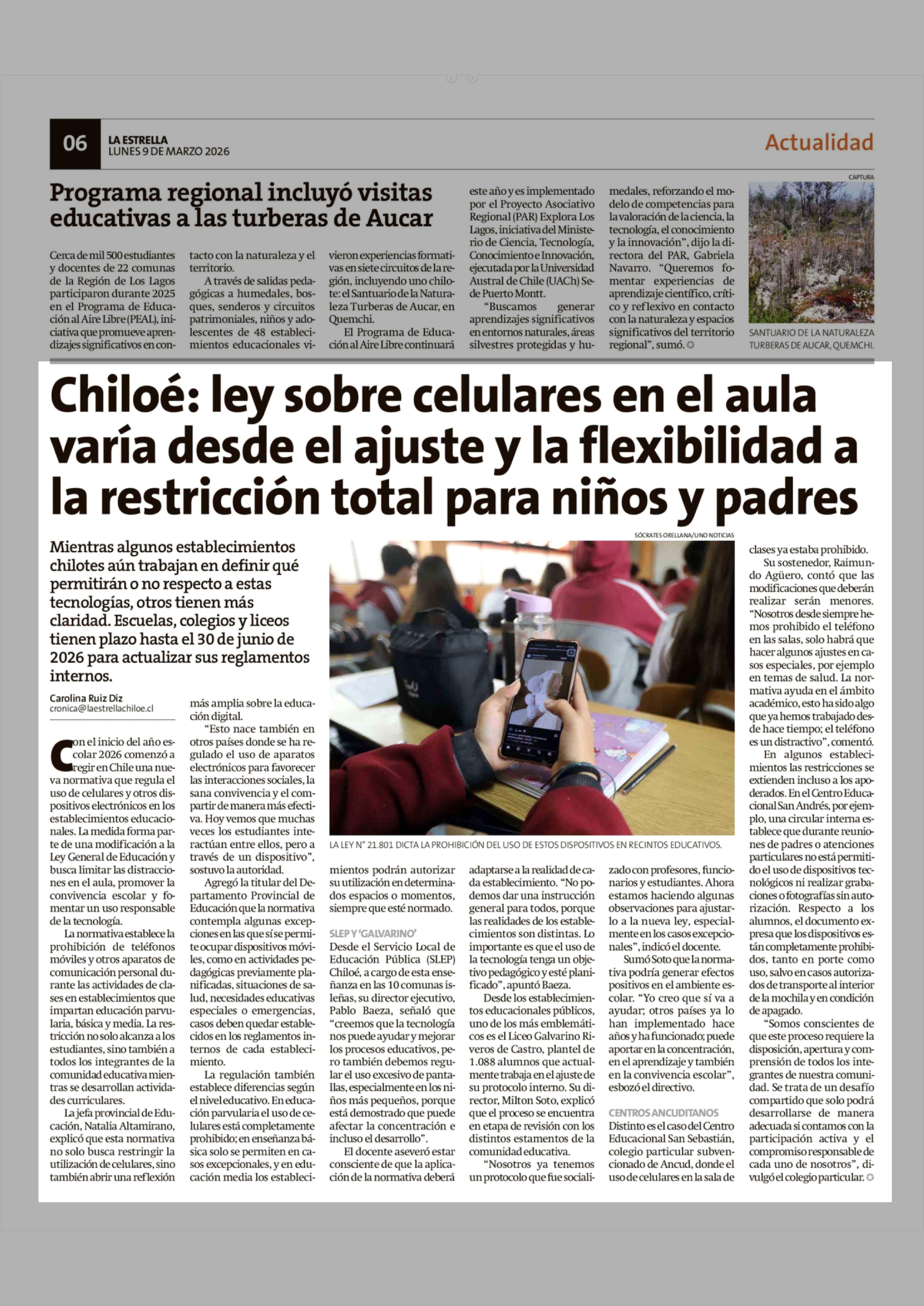 Chiloé: ley sobre celulares en el aula varía desde el ajuste y la flexibilidad a la restricción total para niños y padres 09-03-2026 La Estrella de Chiloé |