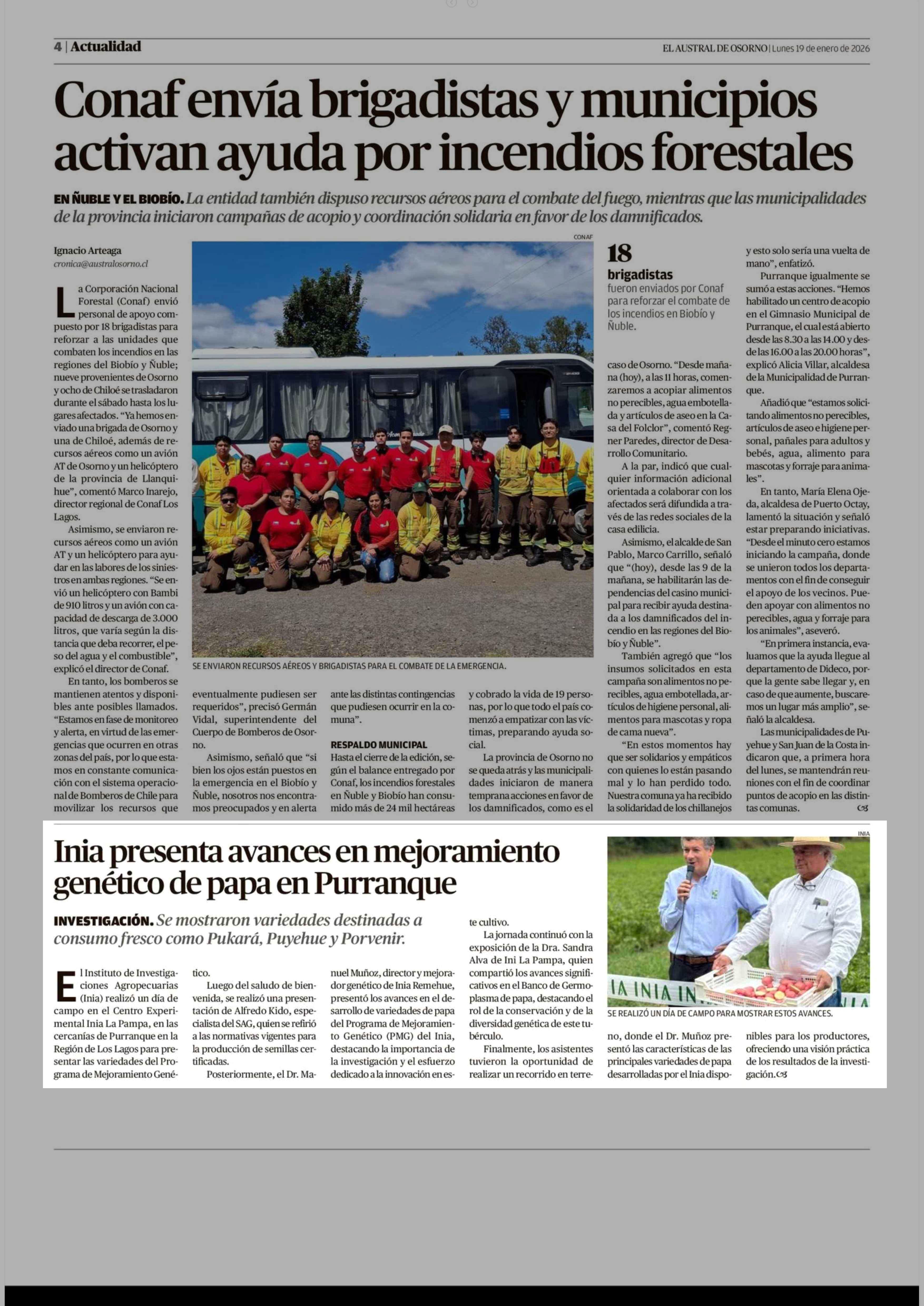 Inia presenta avances en mejoramiento genético de papa en Purranque 19-01-2026 El Austral de Osorno |