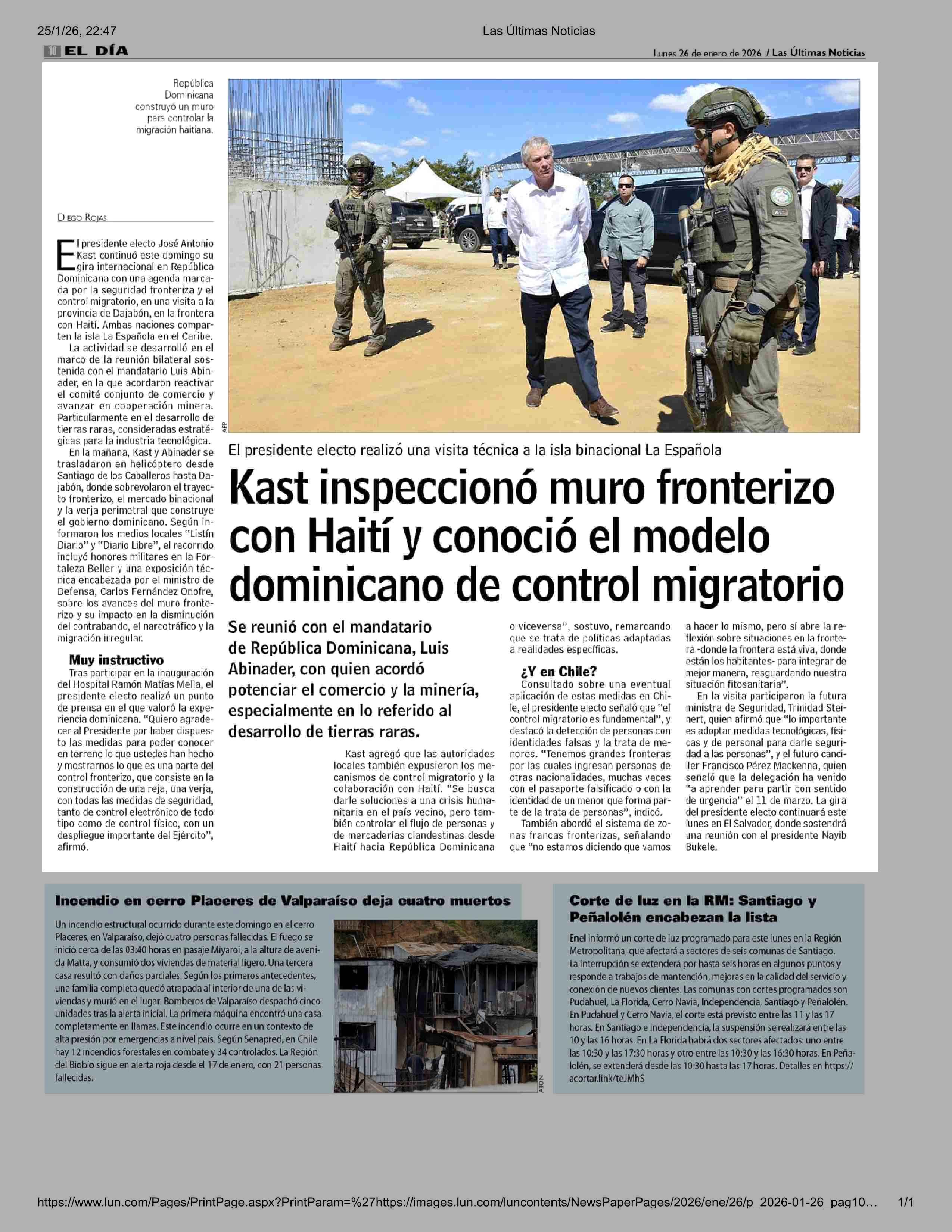 Kast inspeccionó muro fronterizo con Haití y conoció el modelo dominicano de control migratorio 26-01-2026 Las Últimas Noticias |