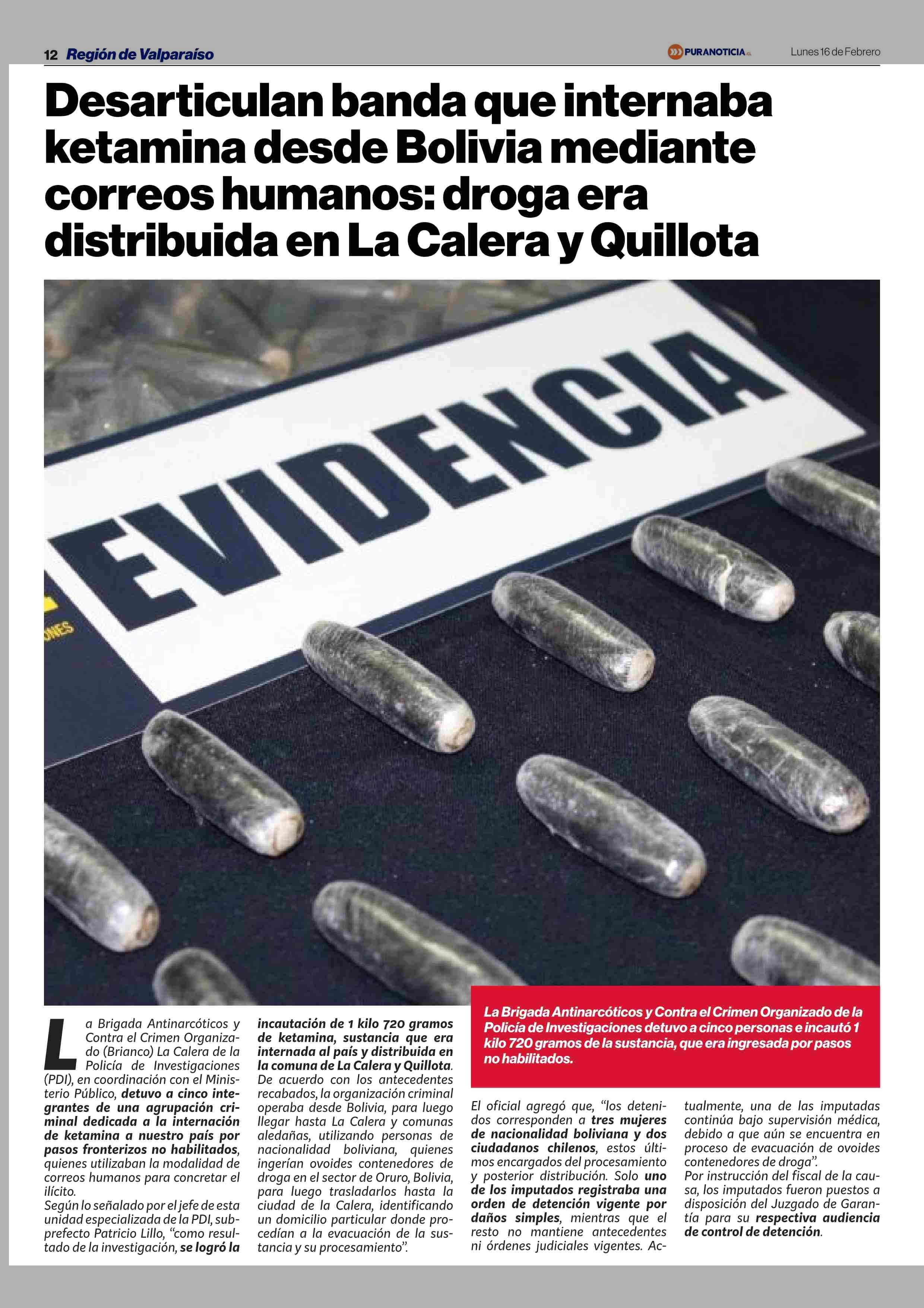 Desarticulan banda que internaba ketamina desde Bolivia mediante correos humanos: droga era distribuida en La Calera y Quillota 18-02-2026 Puranoticia.cl |
