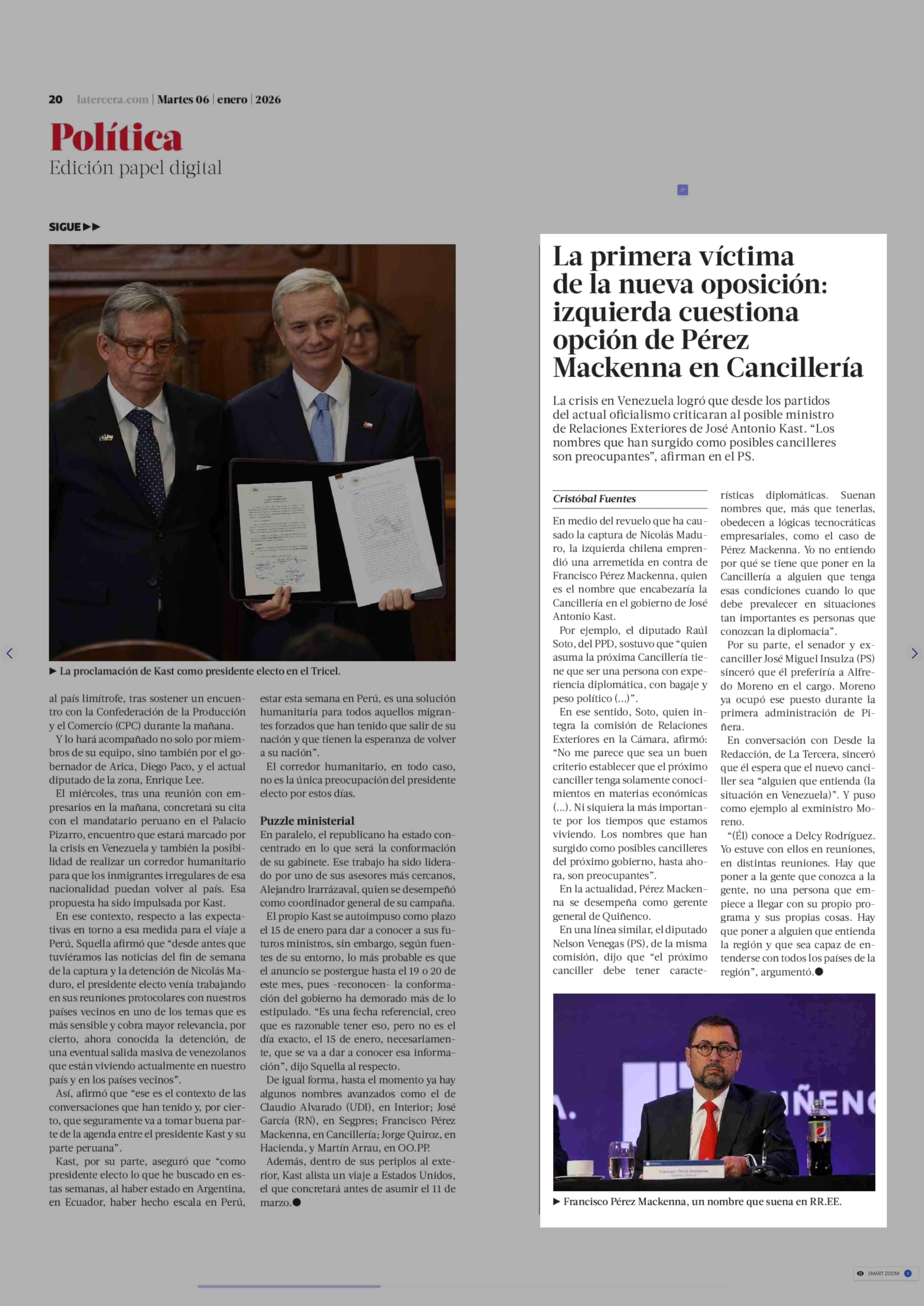 Título: La primera víctima de la nueva oposición: izquierda cuestiona opción de Pérez Mackenna en Cancillería