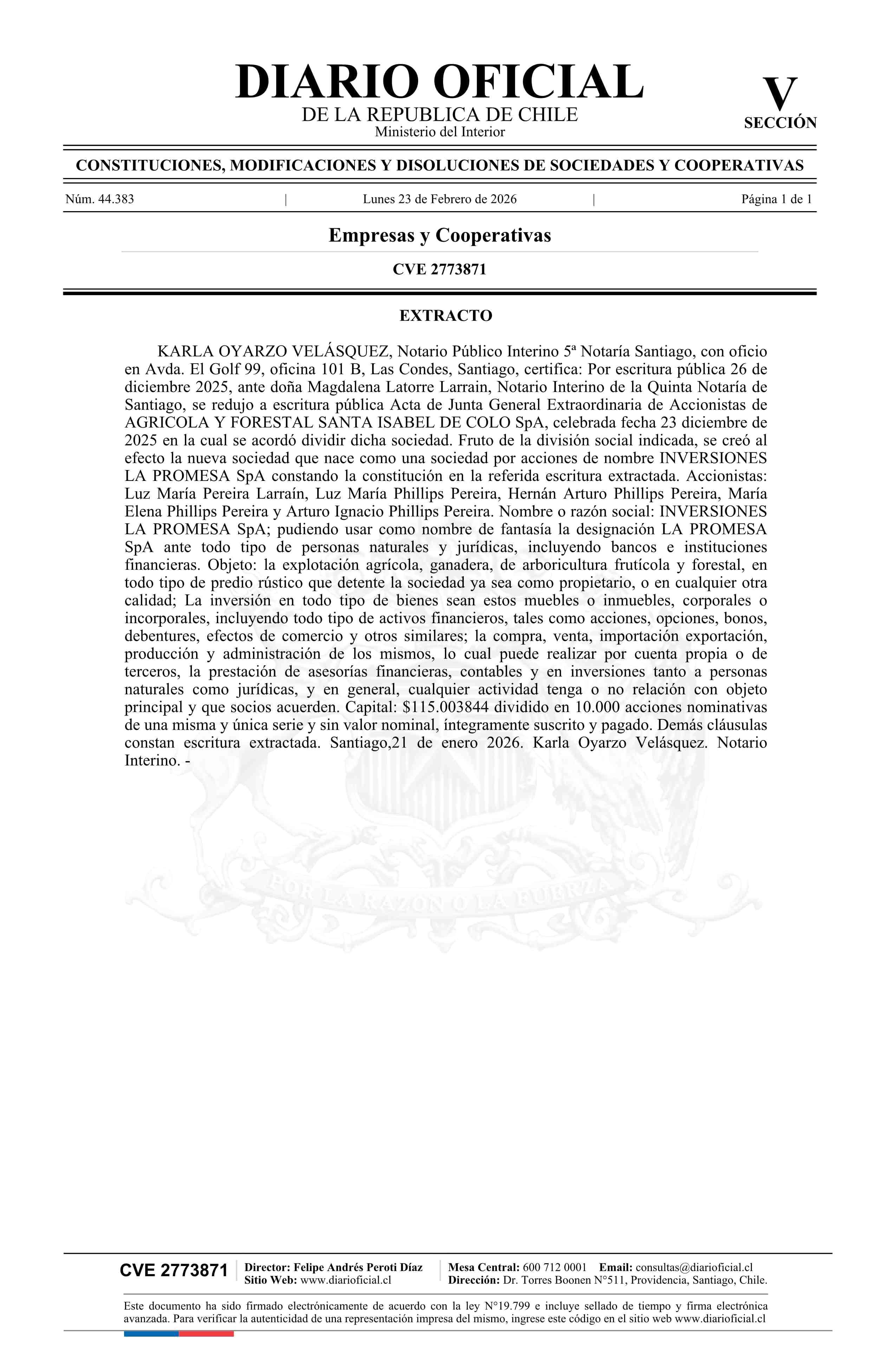 Inversiones La Promesa SpA 23-02-2026 Diario Oficial Edición Electrónica |