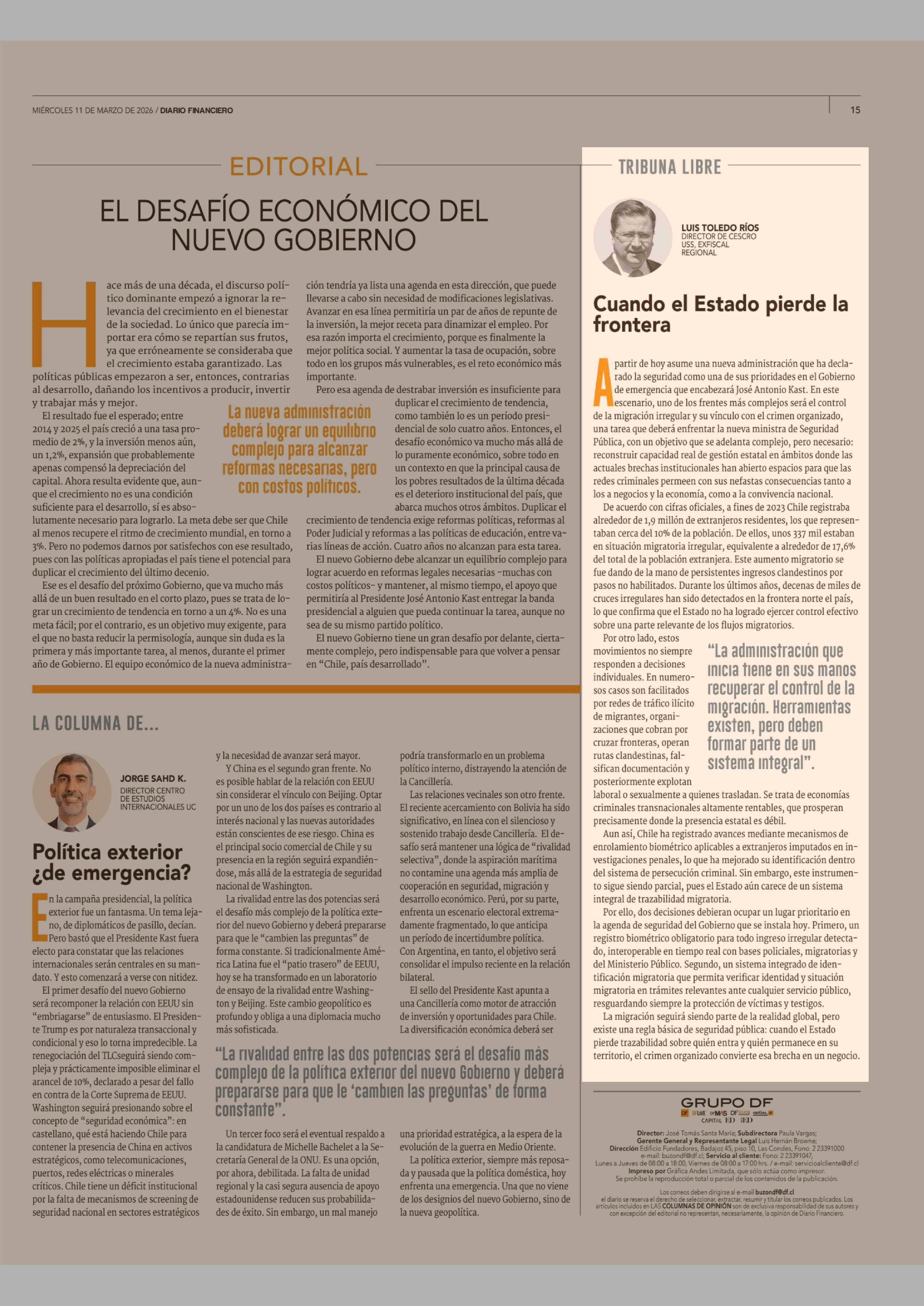 Columnas de Opinión: Cuando el Estado pierde la frontera 11-03-2026 Diario Financiero |