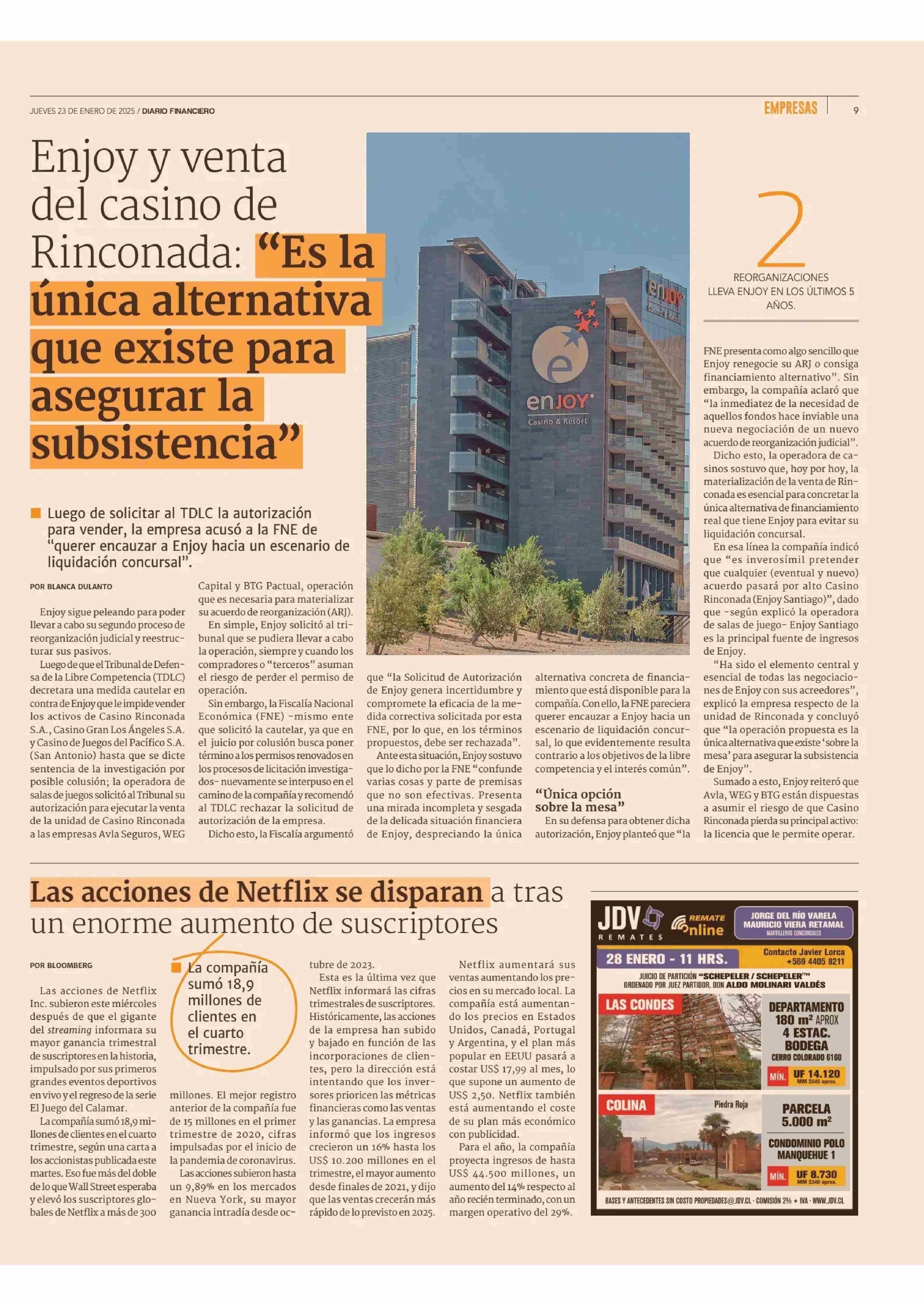 Enjoy y venta del casino de Rinconada: "Es la única alternativa que existe para asegurar la subsistencia" 23-01-2025 Diario Financiero |