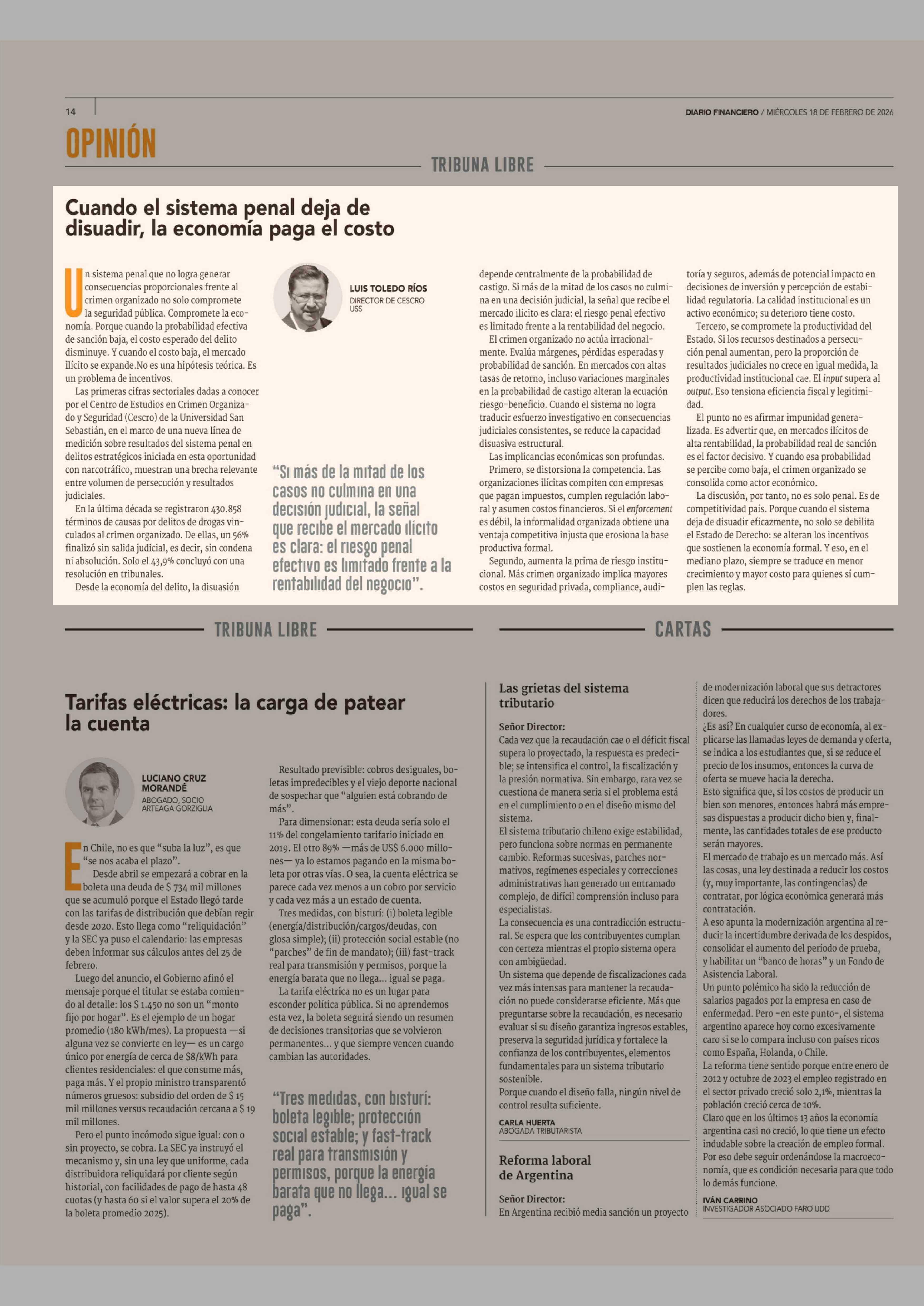 Columnas de Opinión: Cuando el sistema penal deja de disuadir, la economía paga el costo 18-02-2026 Diario Financiero |