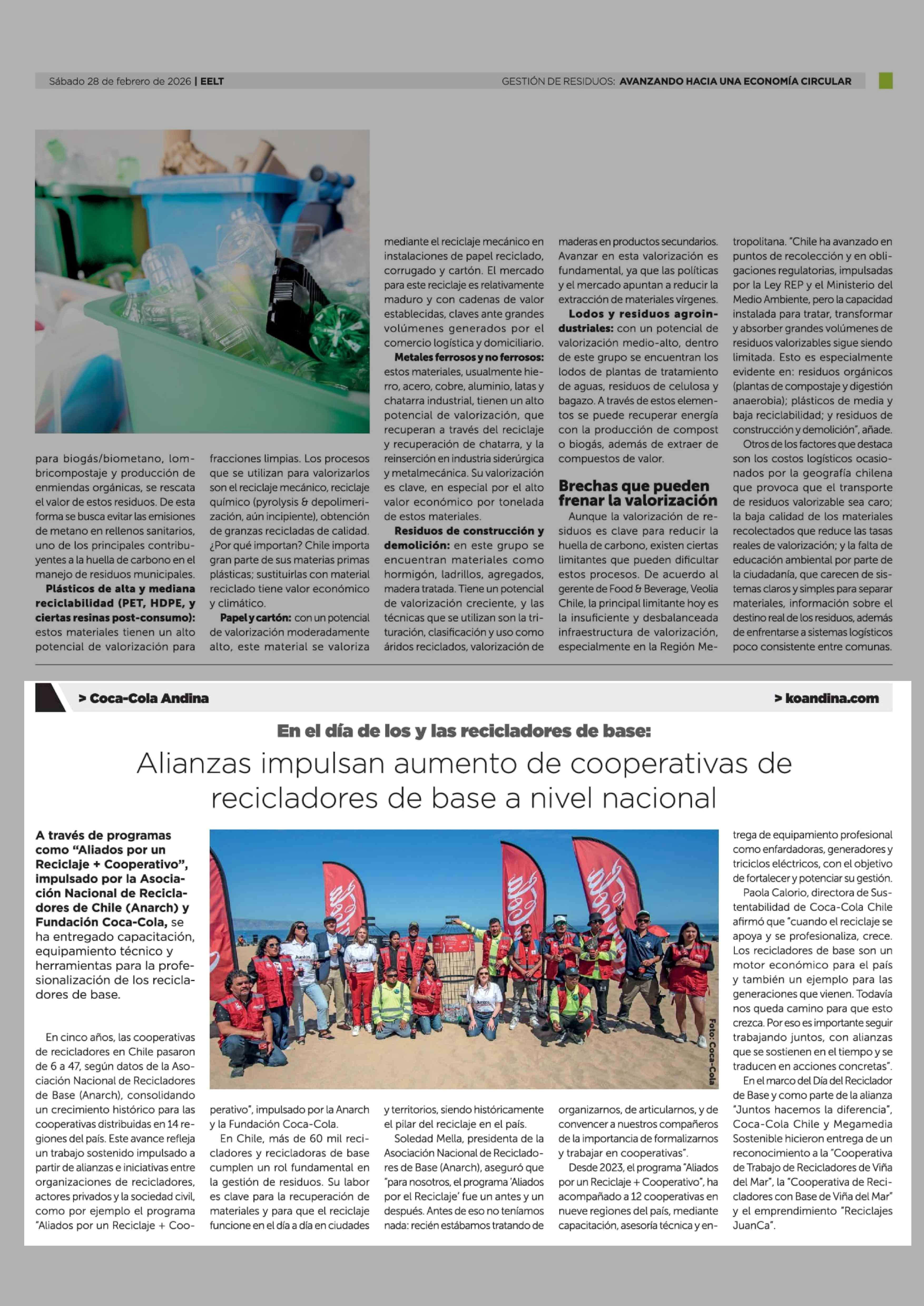Alianzas impulsan aumento de cooperativas de recicladores de base a nivel nacional 28-02-2026 La Tercera |