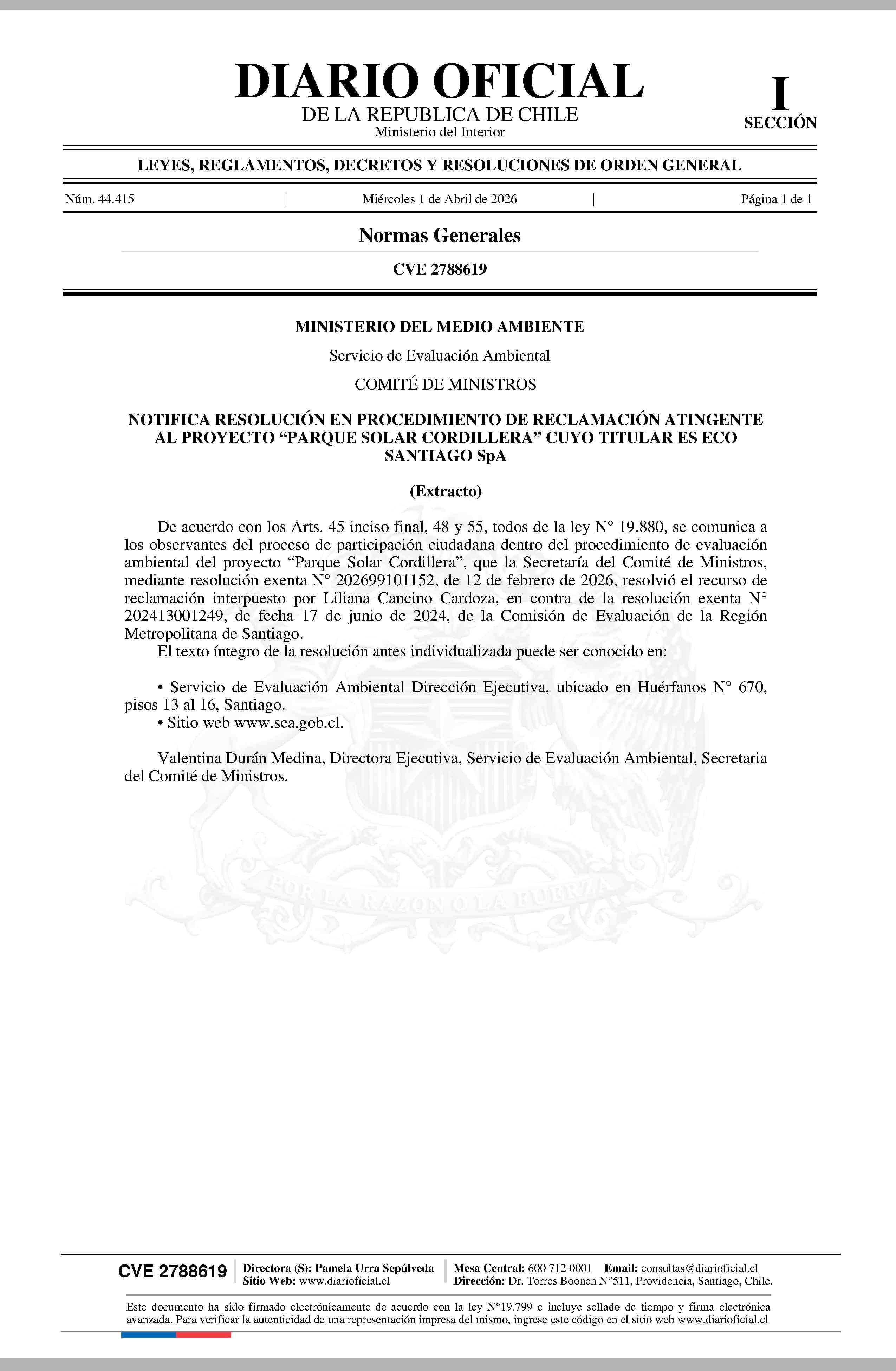 MINISTERIO DEL MEDIO AMBIENTE 01-04-2026 Diario Oficial Edición Electrónica |