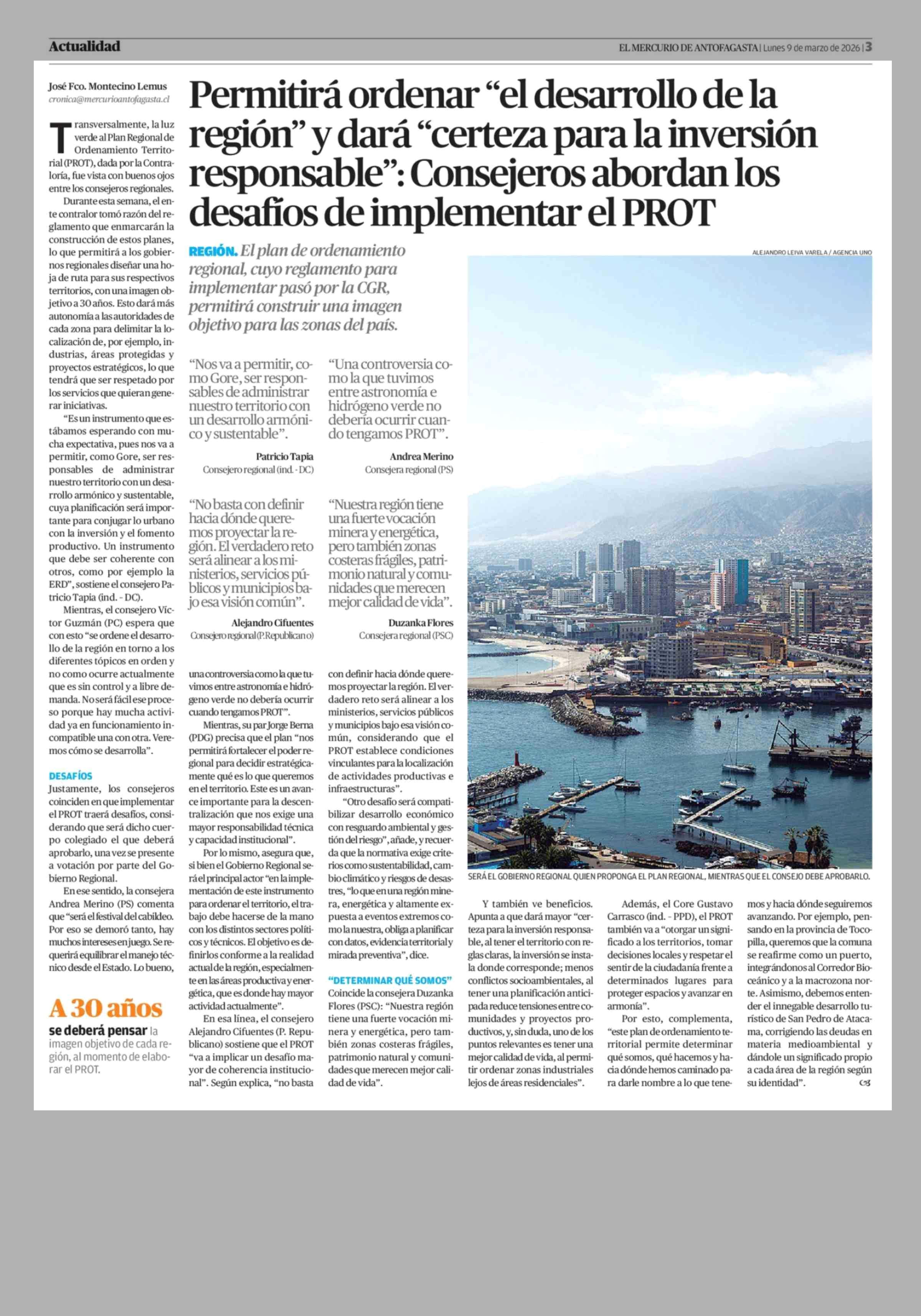 Permitirá ordenar "el desarrollo de la región" y dará "certeza para la inversión responsable": Consejeros abordan los desafíos de implementar el PROT 09-03-2026 El Mercurio de Antofagasta |