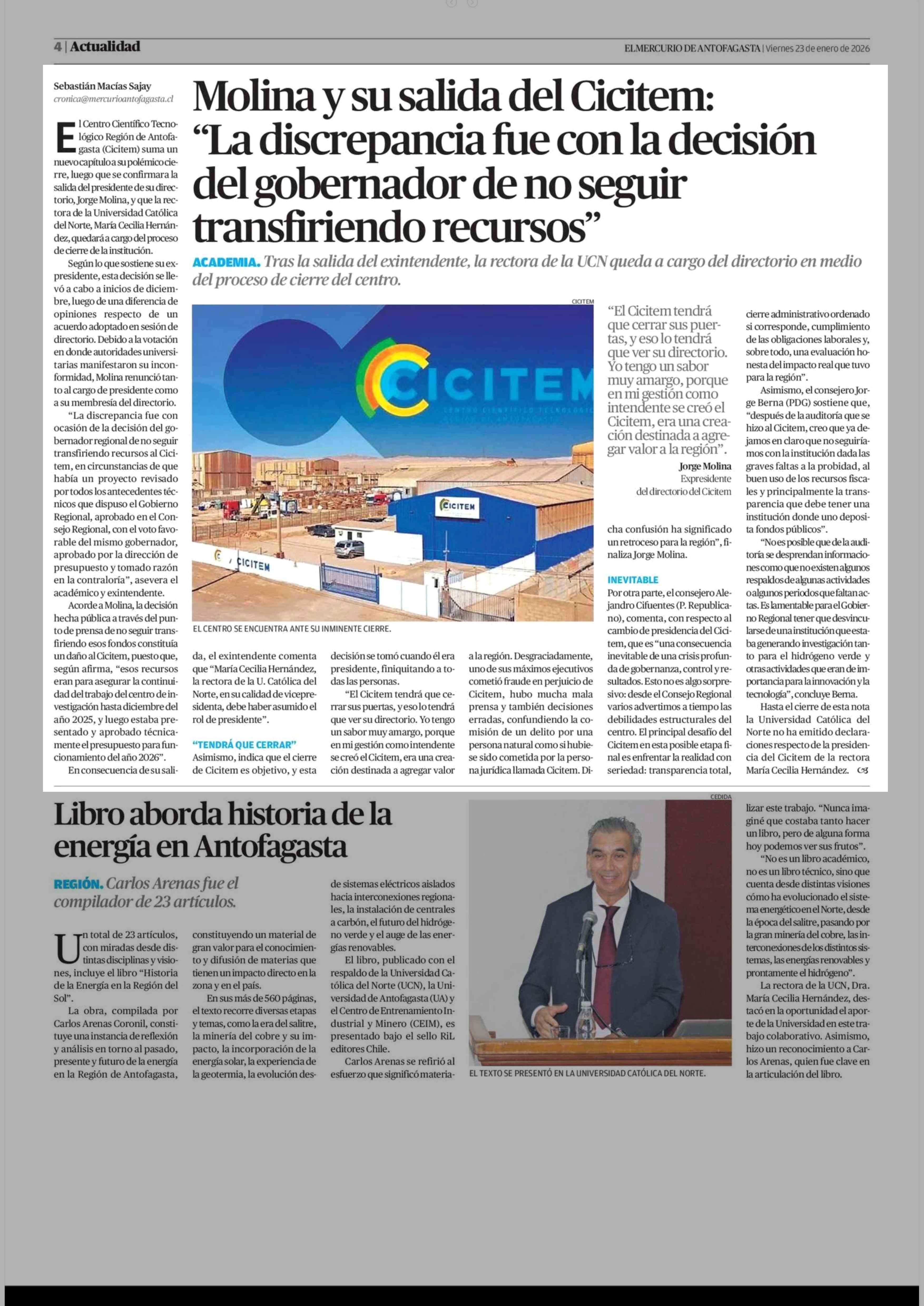Molina y su salida del Cicitem: "La discrepancia fue con la decisión del gobernador de no seguir transfiriendo recursos" 23-01-2026 El Mercurio de Antofagasta |