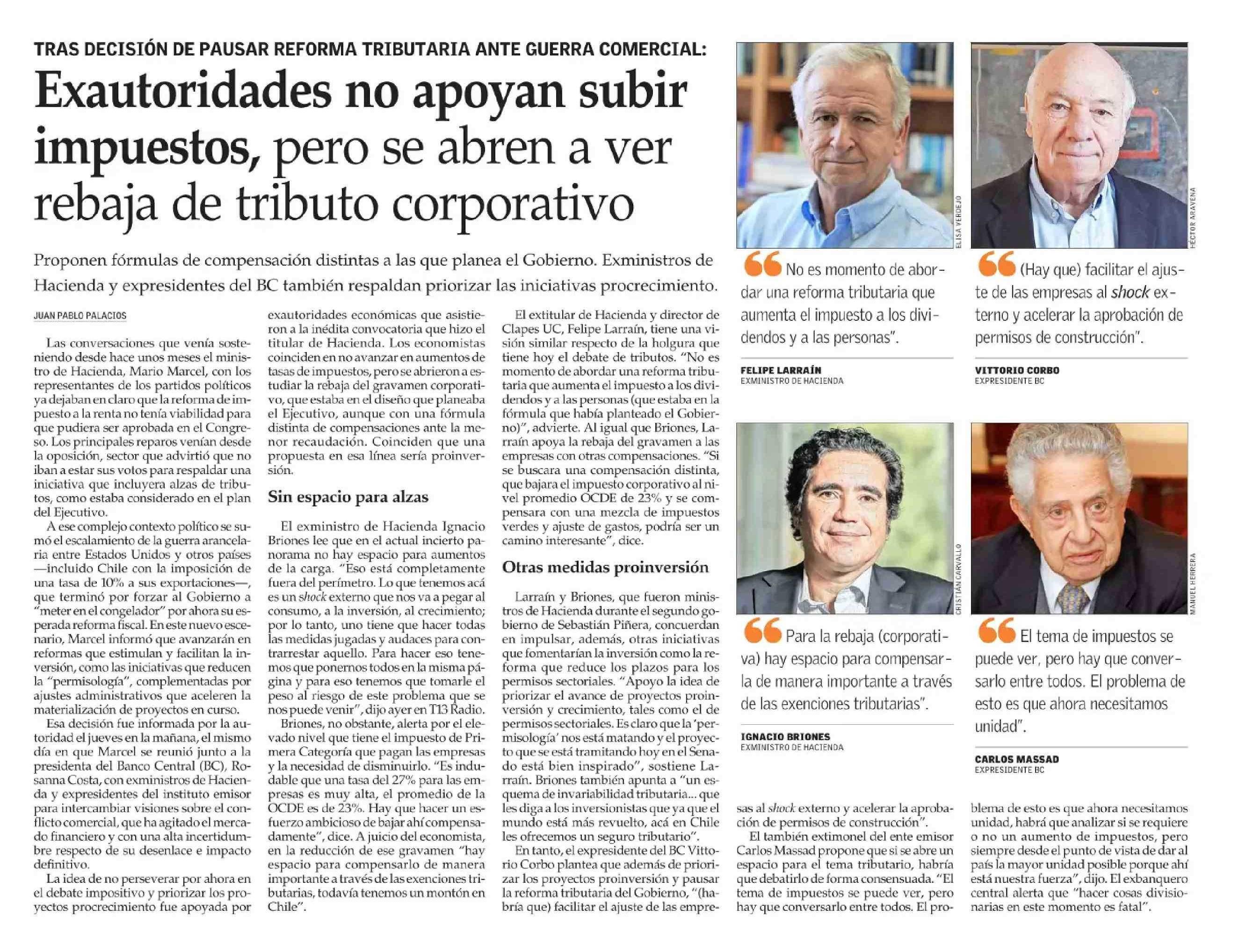 Exautoridades no apoyan subir impuestos, pero se abren a ver rebaja de tributo corporativo 12-04-2025 El Mercurio |