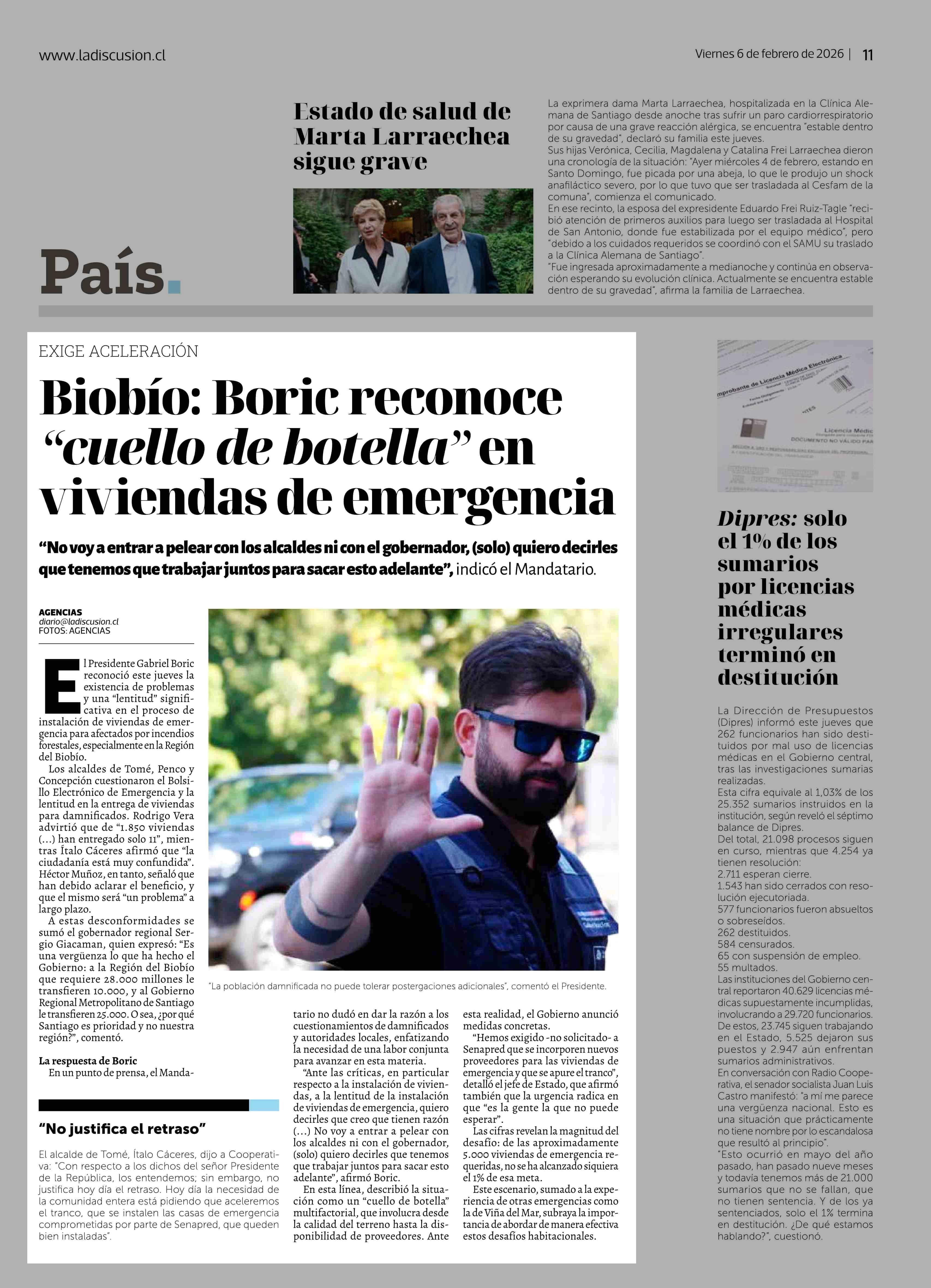 Biobio: Boric reconoce "cuello de botella" en viviendas de emergencia 06-02-2026 La Discusión |